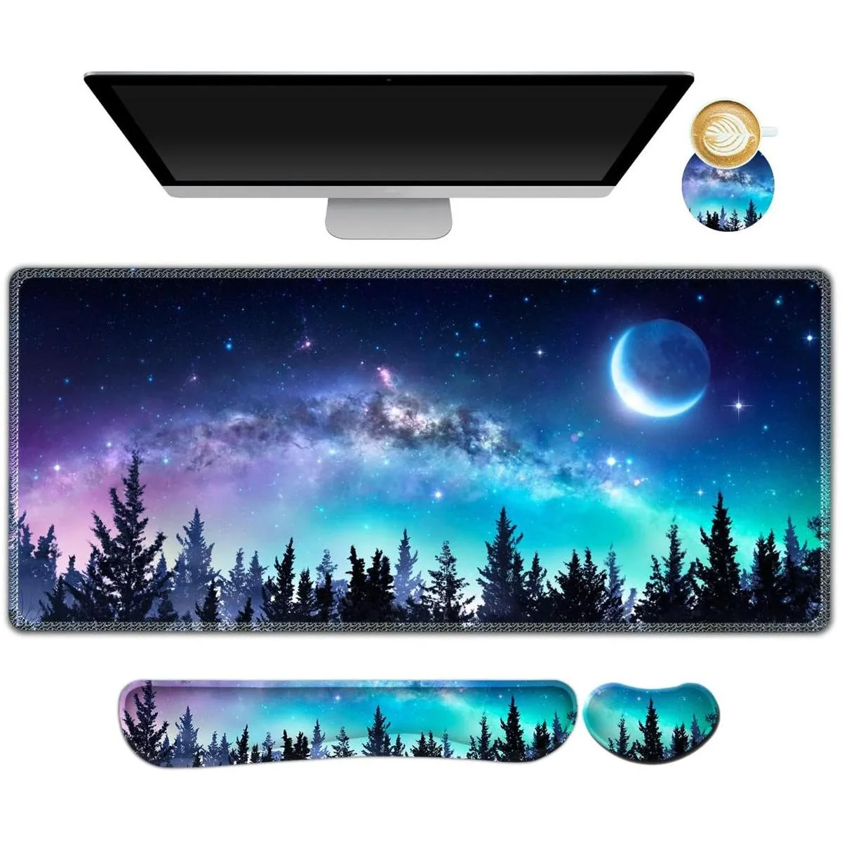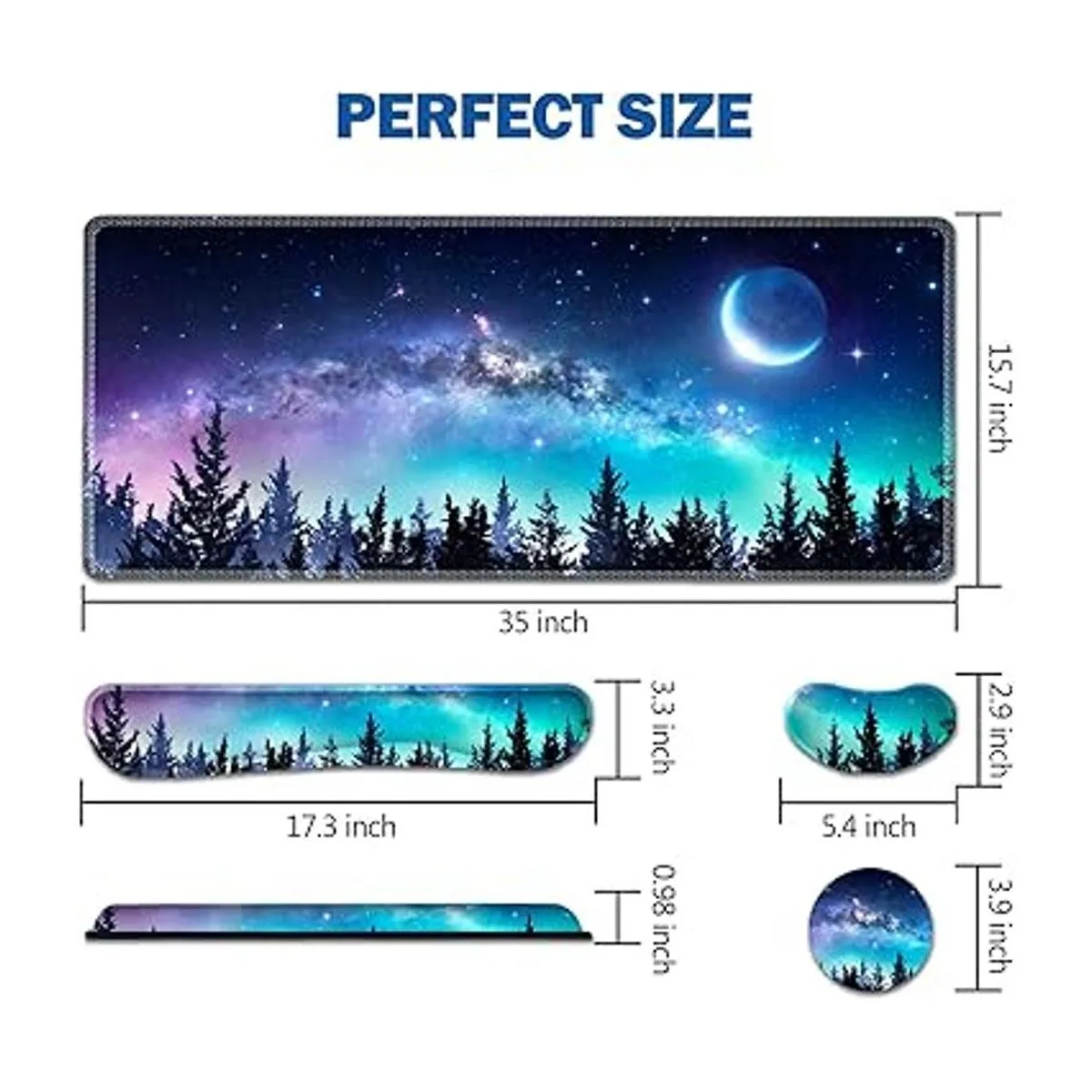 AIMSA Juego de alfombrilla de mouse grande para juegos, soporte de muñeca para teclado alfombrilla de mouse extendida cojín de muñeca posavasos, alfombrilla de escritorio multifuncional ergonómica de espuma viscoelástica de 35 x 15.7 pulgadas cielo de luna bosque