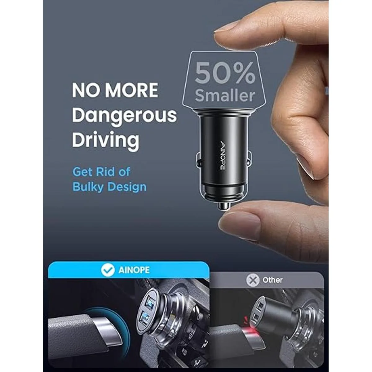 Tamaño compacto: el pequeño cuerpo de tamaño pulgar 1.7 pulgadas de largo x 0.9 pulgadas de ancho se adapta a la mayoría de los encendedores de cigarrillos de coche y apenas sobresale más allá del borde de la toma, proporcionando un aspecto menos desordenado. Es nuestro cargador de coche más pequeño hasta la fecha: ligero y altamente portátil para que puedas llevarlo a todas partes.