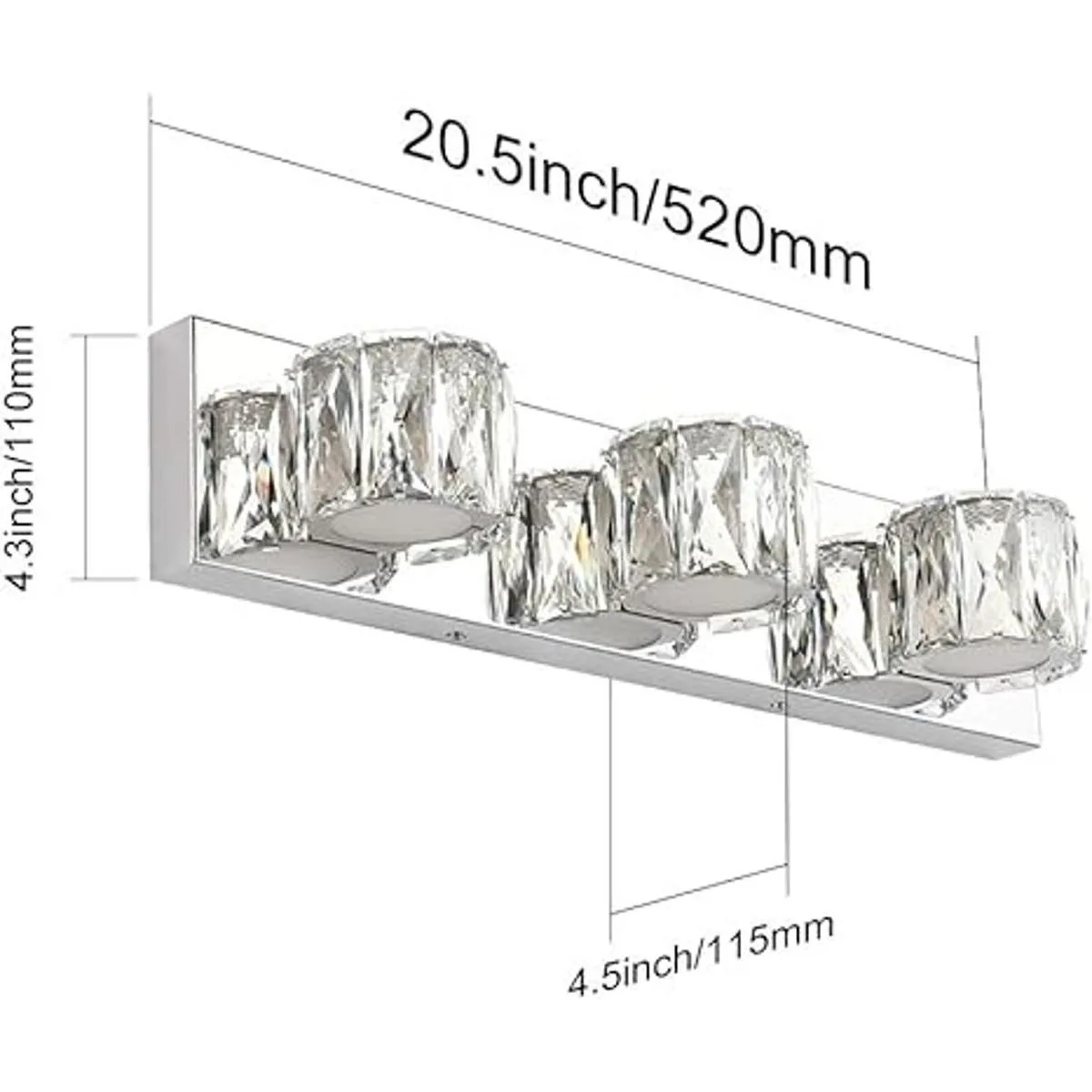 1. Especificaciones: longitud 20.5 pulgadas x ancho 4.3 pulgadas, 4.5 pulgadas extendida desde la pared. Temperatura de color: 5500 K luz blanca. LED de bajo consumo: 18 W.