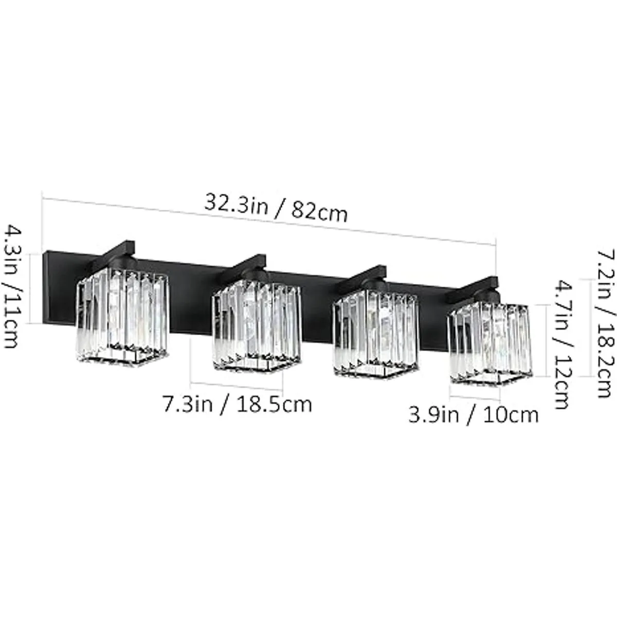 Especificaciones: longitud 32.3 pulgadas x ancho 7.2 pulgadas, 7.3 pulgadas se extienden desde la pared. Las dimensiones de la placa trasera de luz de tocador negra son: 32.3 pulgadas de largo x 4.7 pulgadas de ancho.