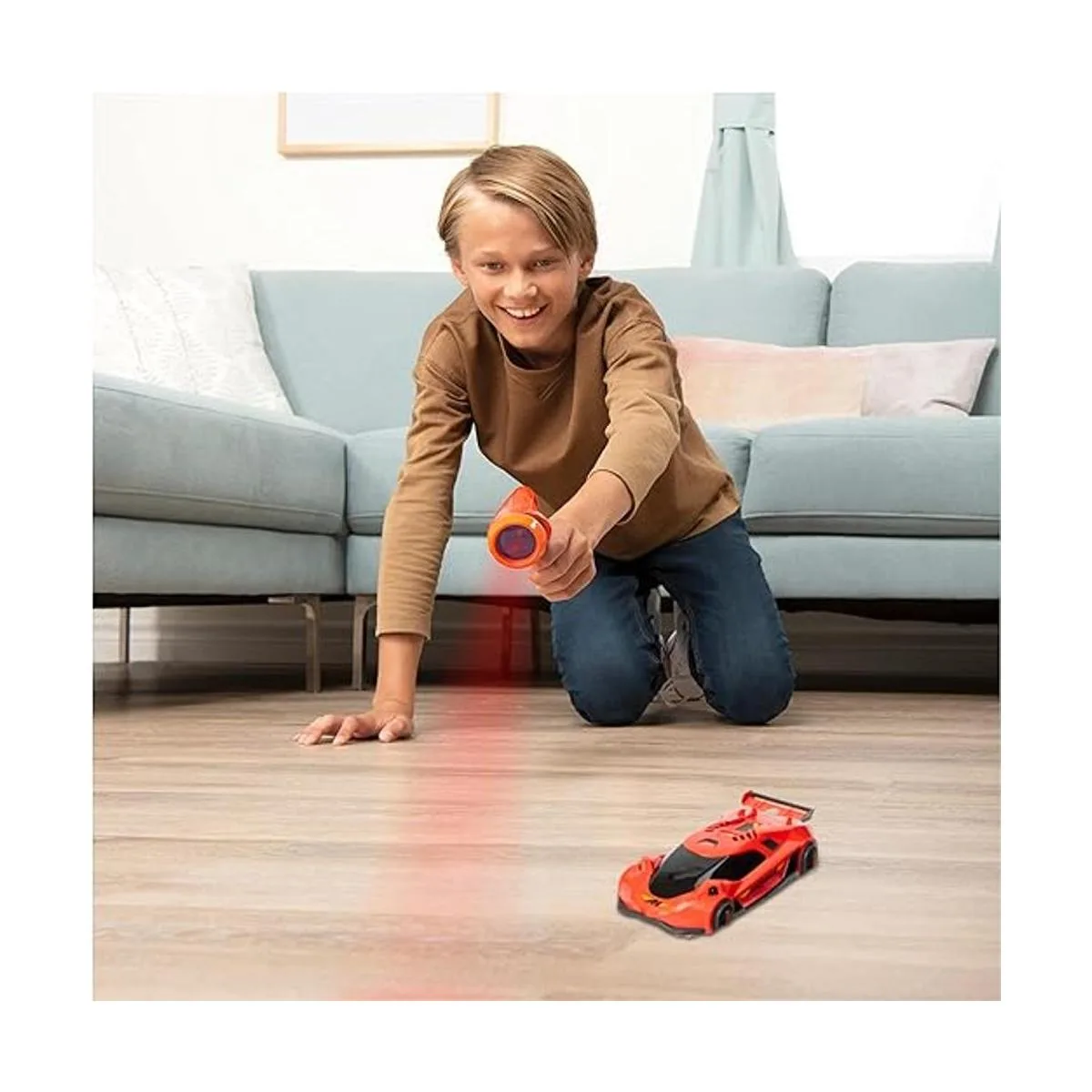 Persigue la luz láser LED: utiliza el controlador de láser para apuntar el haz de luz láser en la pared, techo o suelo, y el coche de carreras láser de gravedad cero perseguirá la luz en cualquier dirección