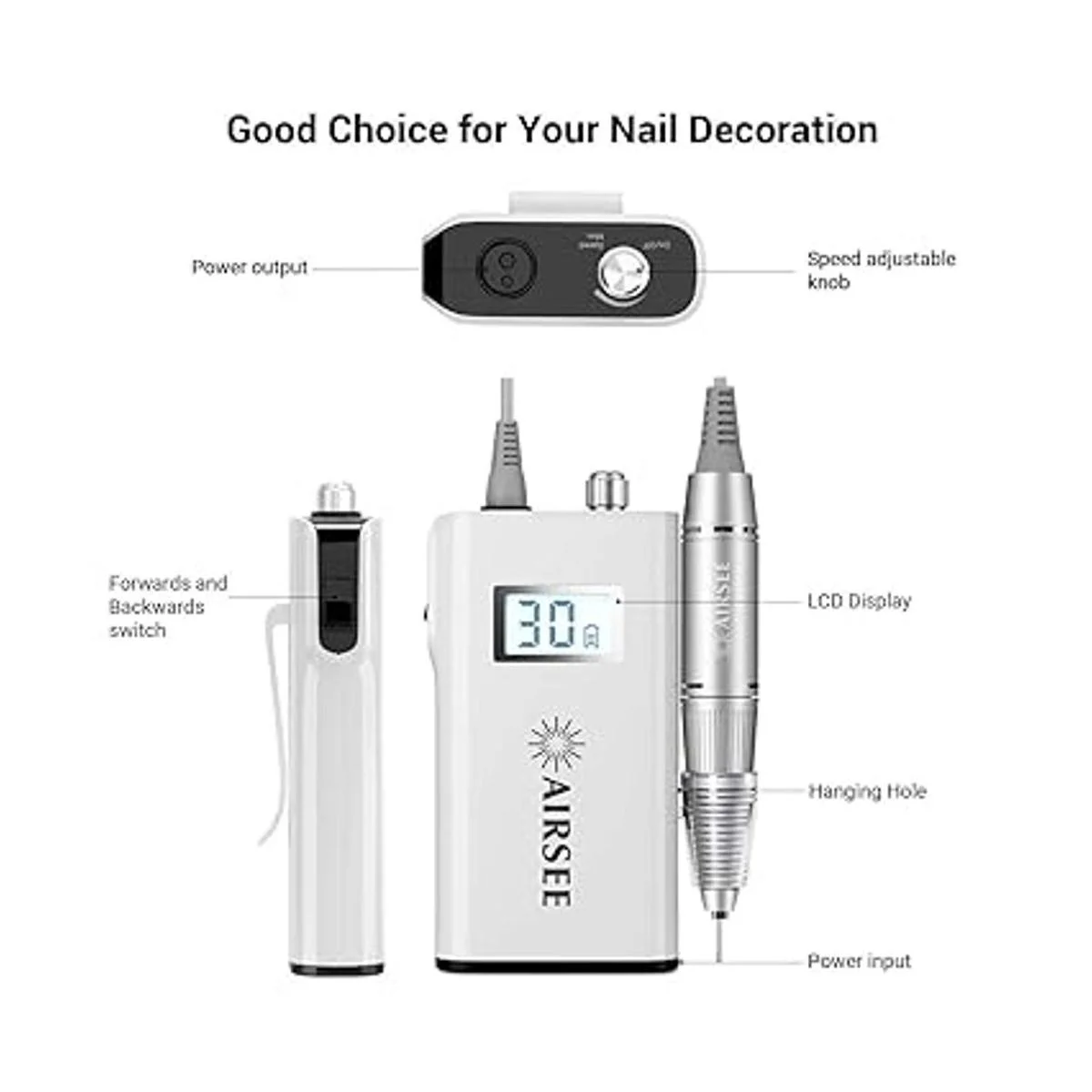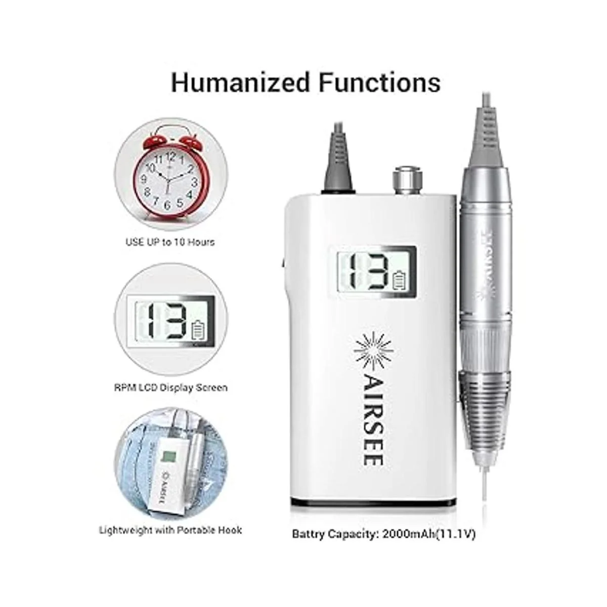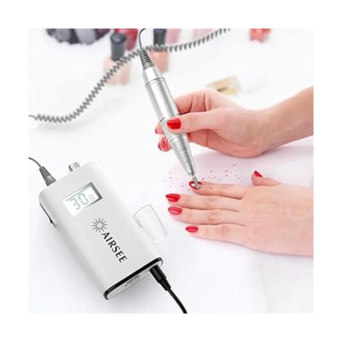 AIRSEE Taladro eléctrico recargable de 30000 rpm, máquina de lima profesional portátil para uñas acrílicas, extensión natural, uñas de gel, cutículas, inalámbricas de alta velocidad para uso en salón o en casa, color blanco