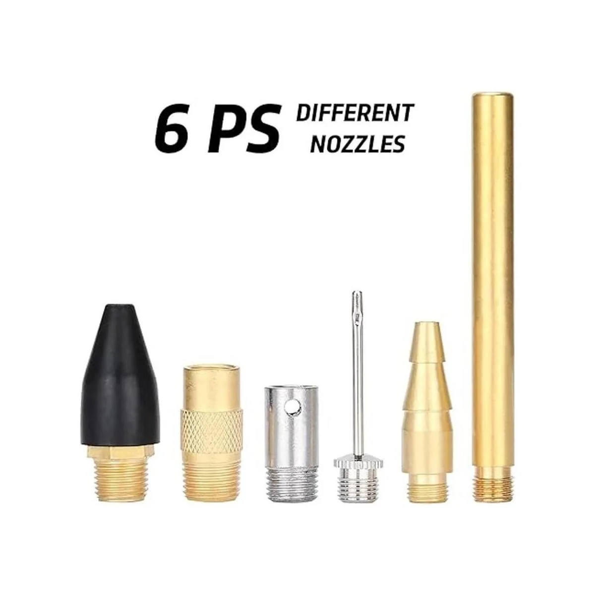Accesorios: incluye de aire con 5 accesorios de boquilla diferentes, cinta de sellado, medidor de neumáticos de lápiz de 10 a 50 PSI, portabrocas de aire de pie de bola, portabrocas de neumáticos