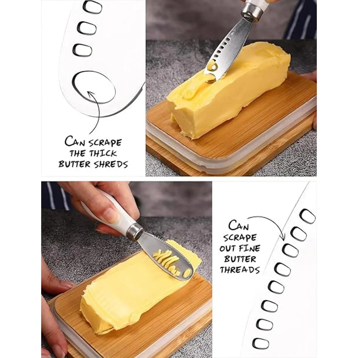 Plato de mantequilla con tapa y cuchillo: la tapa se ha actualizado, por lo que cuando quieras utilizar el cuchillo de mantequilla, ya no tienes que buscar el cuchillo, y la tapa viene con un cuchillo de mantequilla multiusos, la tapa se adapta perfectamente al cuchillo de mantequilla, ahorrando espacio, y el cuchillo de mantequilla tiene una mancha, raspa, rebanando tres funciones, cuando cortas y extiende mantequilla, la cubierta puede ser tabla de cortar.