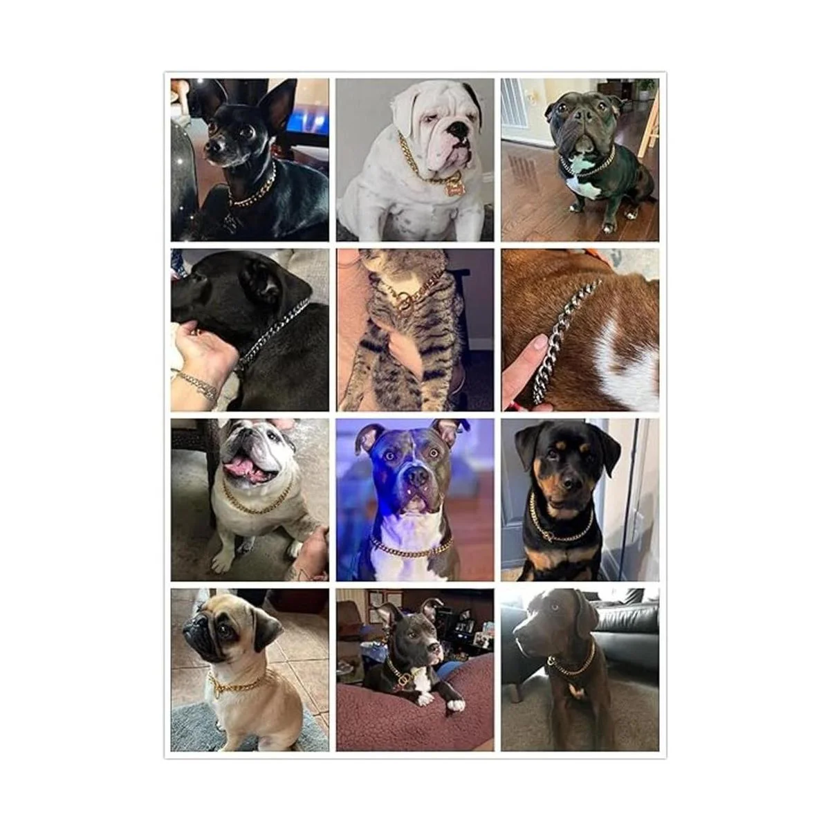 Material del collar de perro dorado: la cadena del collar es de acero inoxidable 316L sólido, el collar de perro está disponible en dos colores, chapado en oro de 18 quilates y plata. El material es firme y masticable, respetuoso con el medio ambiente y tiene una larga vida útil. Es una gran pieza de regalo para perros