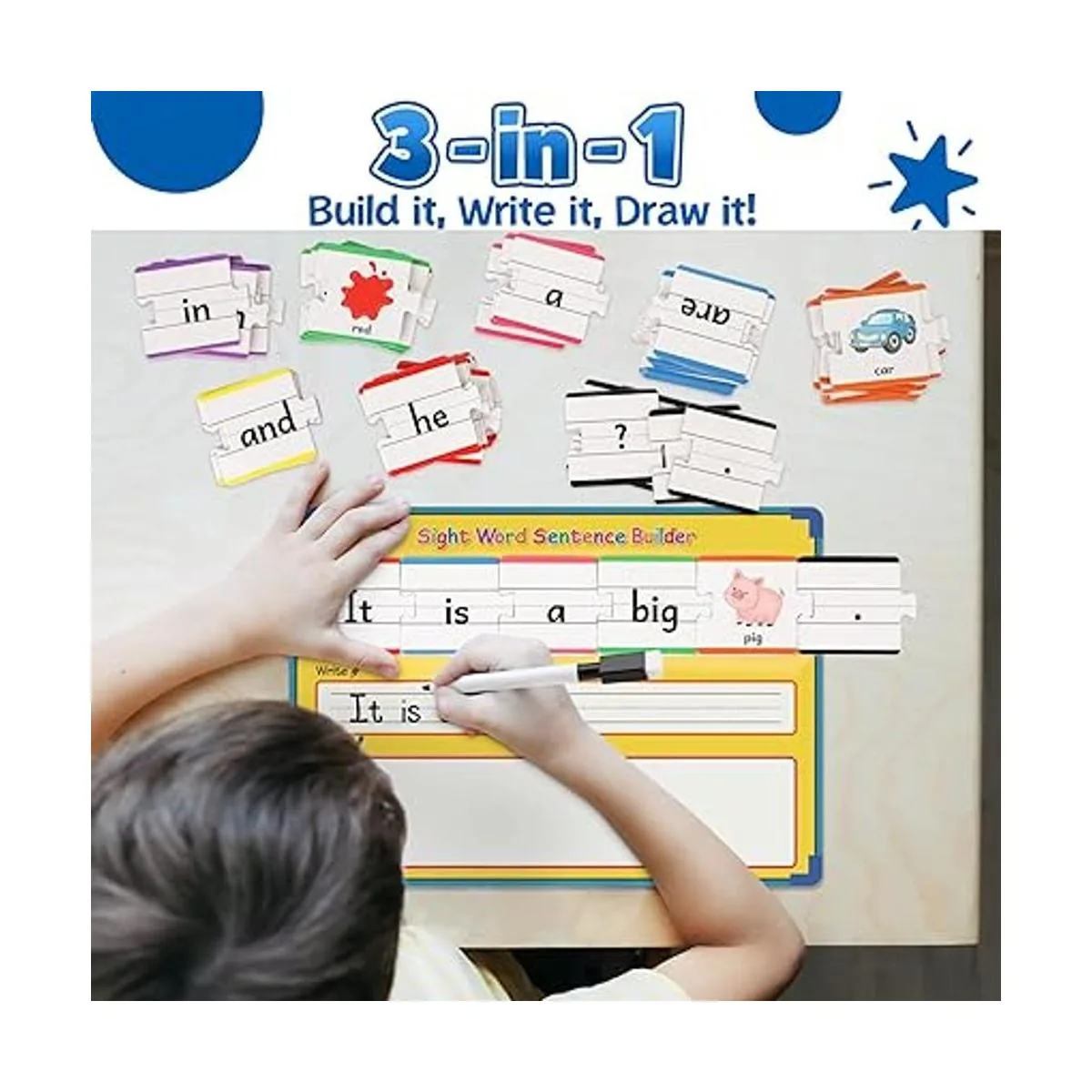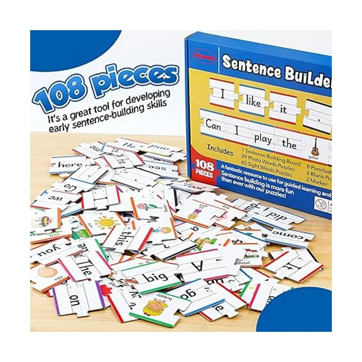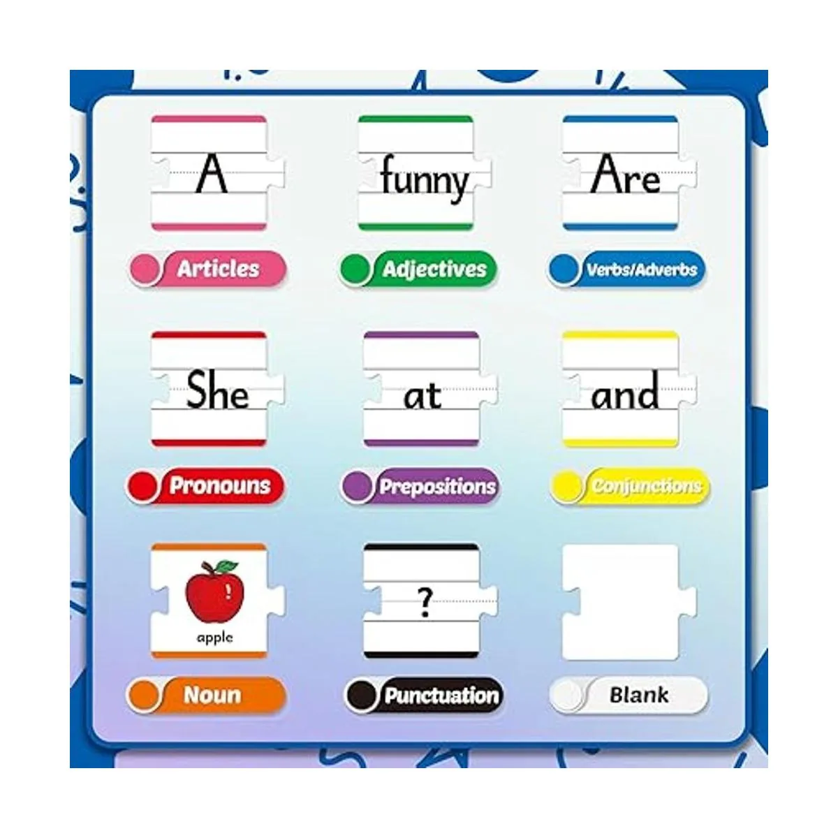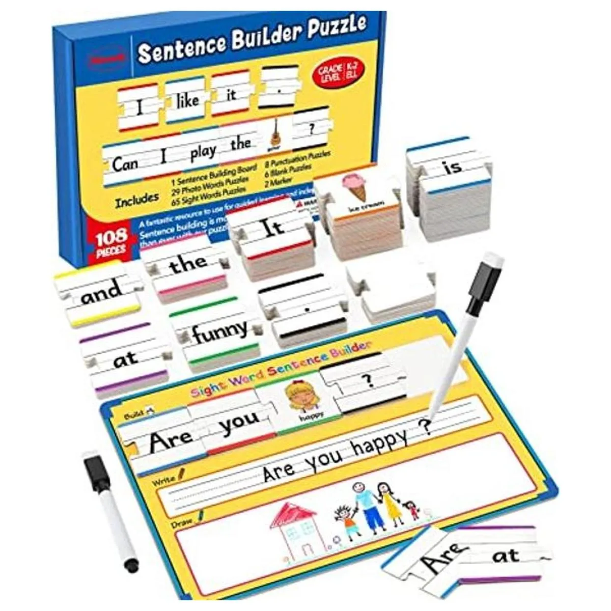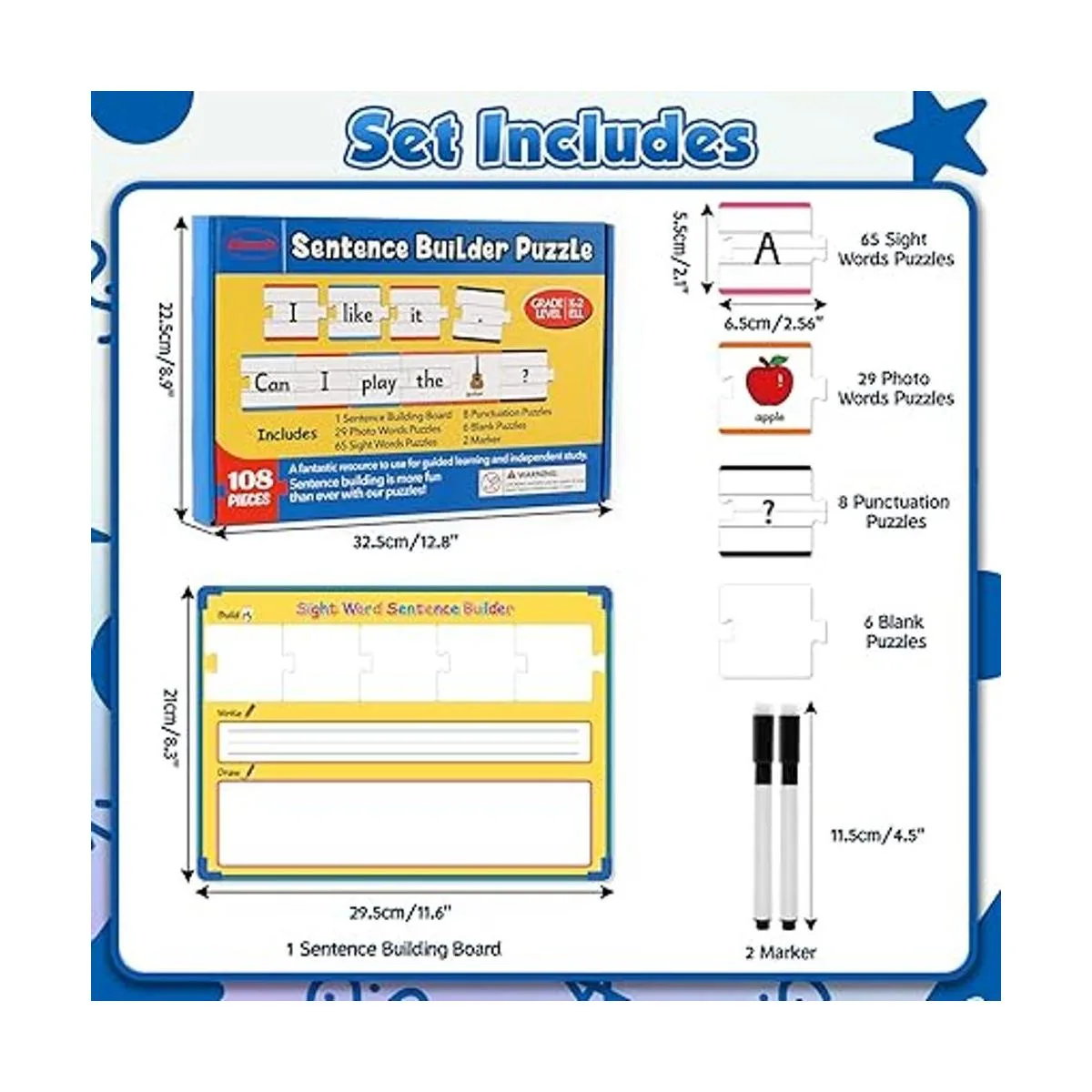 Rompecabezas de 108 piezas: esta herramienta de aprendizaje cuenta con 65 rompecabezas de palabras de vista codificados por colores por partes del habla, 29 rompecabezas de palabras fotográficas, 8 rompecabezas de puntuación, 6 rompecabezas en blanco, 2 marcadores de borrado en seco y borrador, 1 tablero de construcción de oraciones de doble cara puedes construir una frase, luego escribirlo, dibujar. El rompecabezas de 108 piezas te permite crear innumerables frases. Es una gran herramienta para desarrollar habilidades tempranas de construcción de oraciones