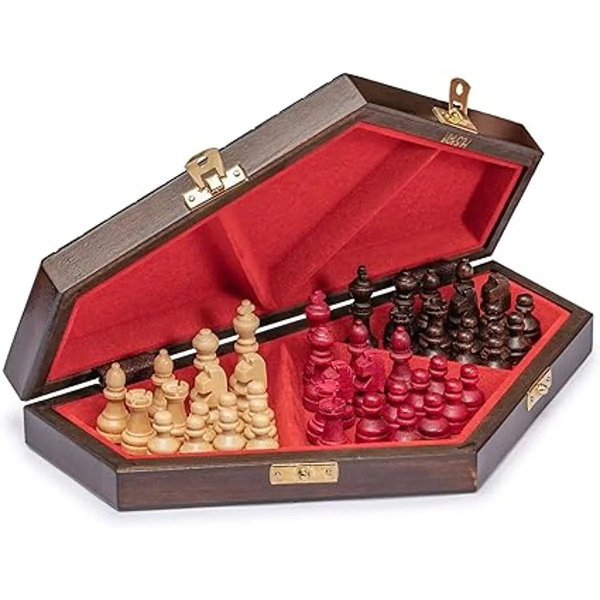 El plegable, hexagonal, tablero de ajedrez es hecho a mano a partir de madera de haya y abedul; su compacto tamaño y la forma cuando se pliega y clasped cerrado lo hacen muy portátil y muy fácil de llevar en viajes; cuando está abierto, la junta medidas 12.7 inches x 10.9 inches x 0.9 inches 32,3 cm x 27.6 cm x 2,2 cm
