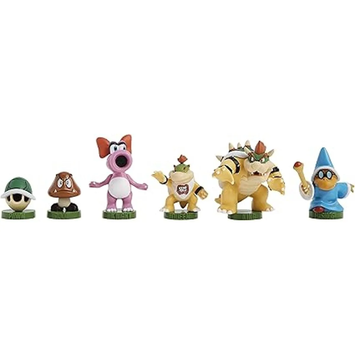 Incluye Mario, Luigi, la princesa Peach, Yoshi, Toad, 1up seta, Bowser, Bowser Jr, Birdo, Goomba, martillo Bros, y Magikoopa