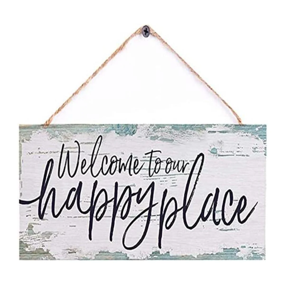 AJHERO Letrero decorativo colgante de madera de 6 x 12 pulgadas con texto en inglés Welcome to Our Happy Place, color azul náutico, 6