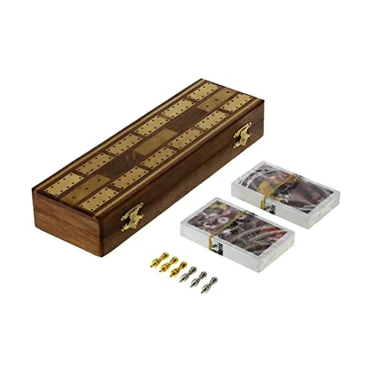 Ajuny Traditonal Juego de mesa de madera con 6 clavijas de metal y 2 barajas de cartas con tablero de área de almacenamiento, tamaño de 10 x 3 x 1.75 pulgadas