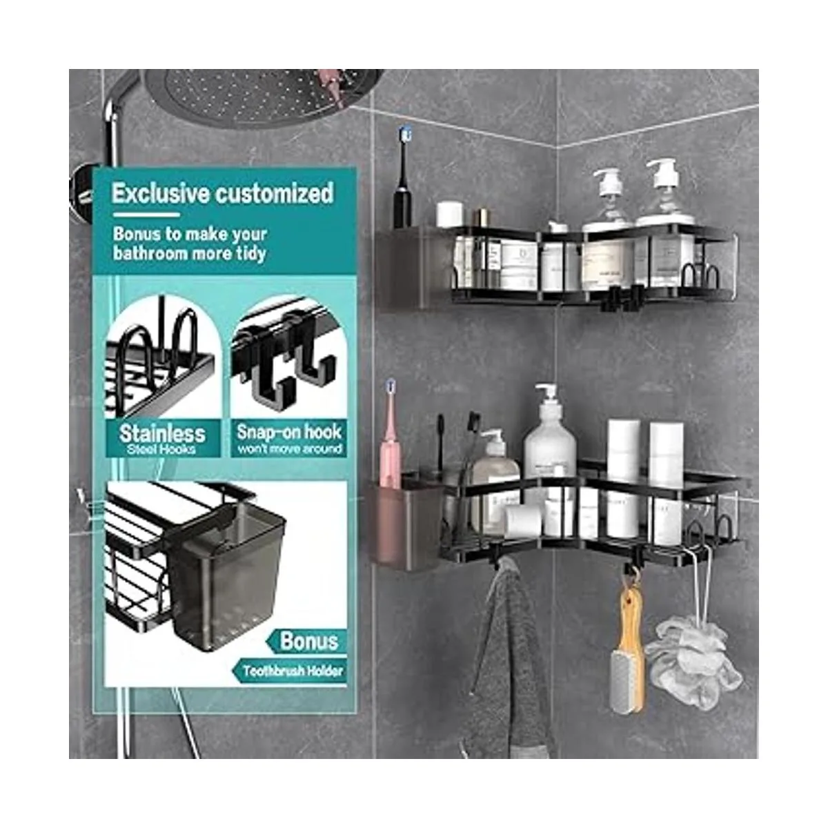 AKTECKE Organizador de ducha esquinero, paquete de 2 estantes organizadores adhesivos de esquina de ducha, sin perforación, estante de almacenamiento de ducha de acero inoxidable con ganchos y soporte para pasta de dientes para baño, dormitorio y cocina