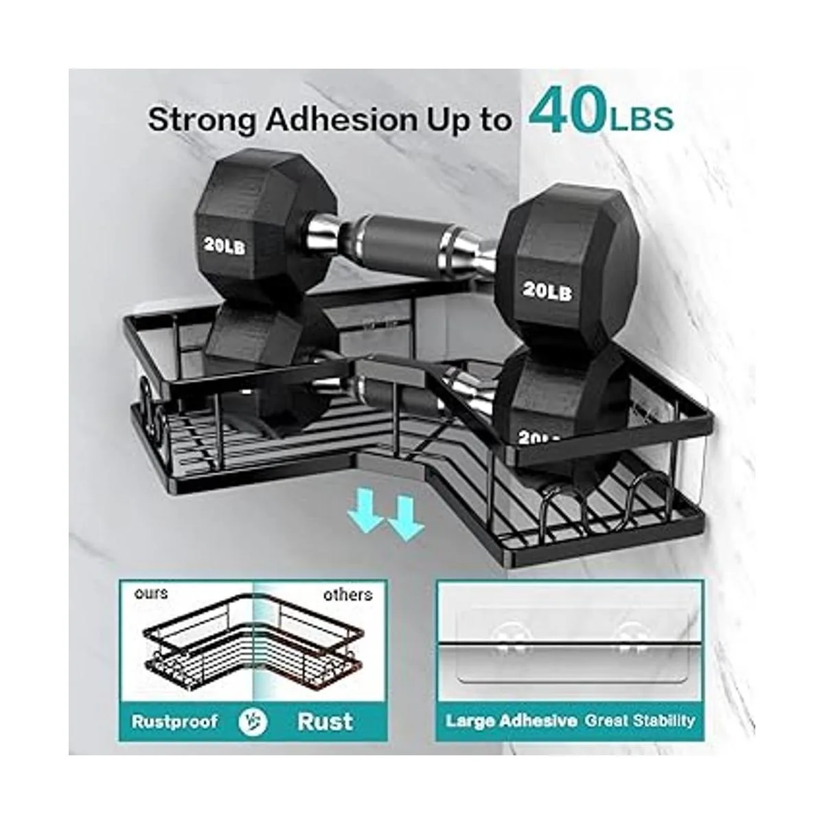 Adhesivo fuerte y resistente: el adhesivo es súper pegajoso para superficies planas y proporciona una fuerte sujeción de hasta 40 libras. El organizador de ducha es muy resistente para contener botellas grandes, como champú y acondicionador de tamaño de galón, gel de baño y otros artículos bastante pesados. Nota: este estante de ducha se adapta solo a esquinas de pared de 90 grados, no apto para espacios redondeados o curvos.