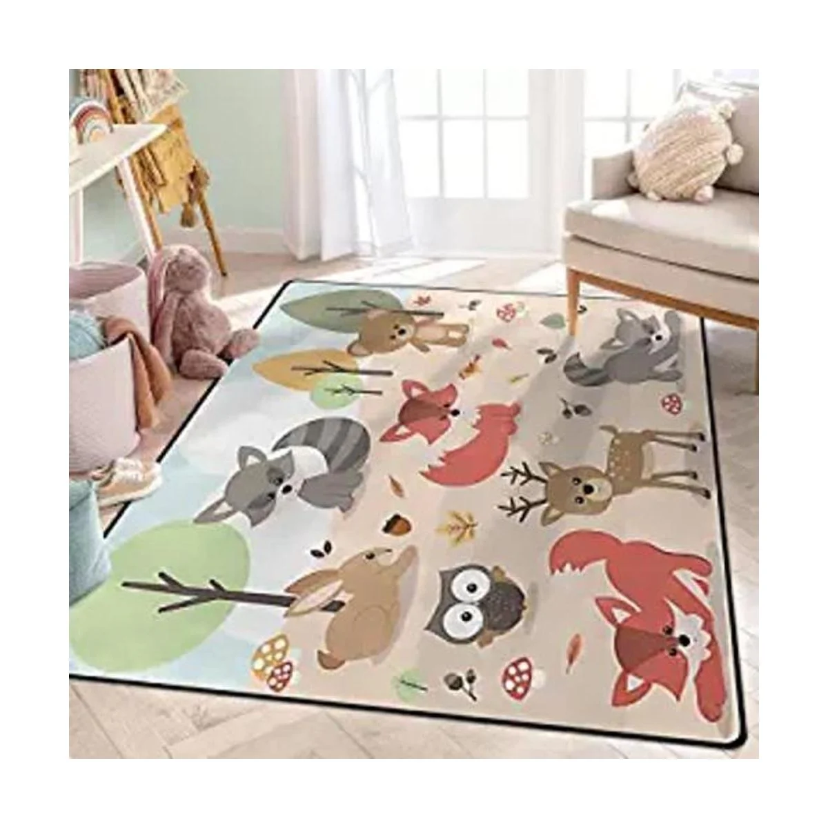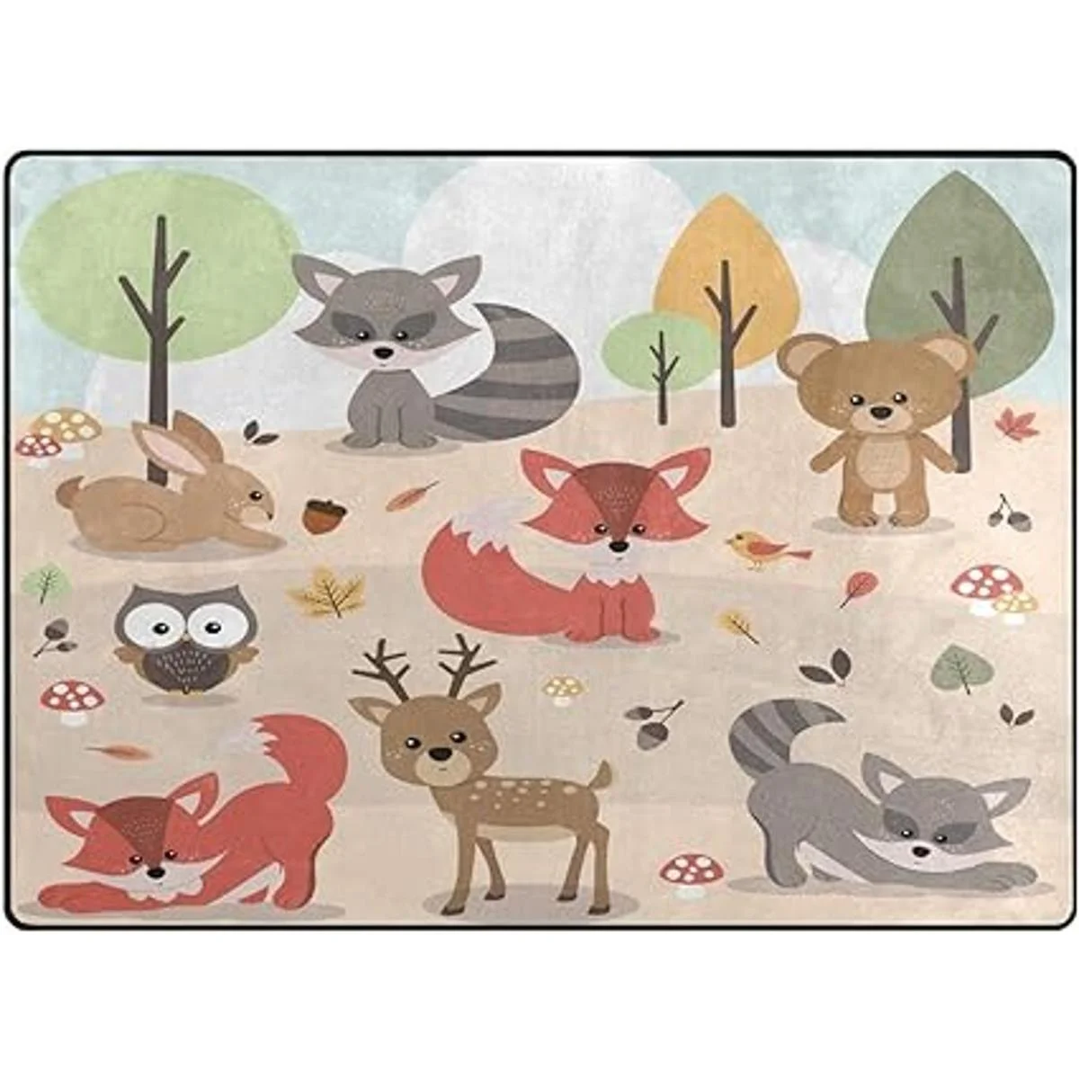 ALALAL Alfombra de área de animales del bosque de dibujos animados, bonita alfombra de bosque, ciervo, conejo, zorro, búho, pájaro, para guardería, habitación de niños y niñas, sala de juegos, sala de estar, decoración del hogar, 5 x 7 pies 80 x 58 pulgadas, rosa