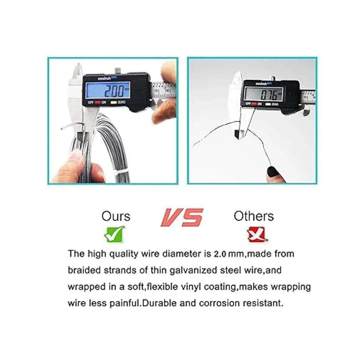 Alambre flexible para marco de fotos fácil de usar: el alambre trenzado para fotos está hecho de hebras trenzadas de alambre de acero galvanizado fino. Esto hace que el alambre acabado sea fuerte y envuelto en un revestimiento de vinilo suave y flexible, pero lo suficientemente flexible como para doblarse y envolver fácilmente, hace que envolver el alambre sea menos doloroso. El alambre y el revestimiento no se corroen ni se decoloran.