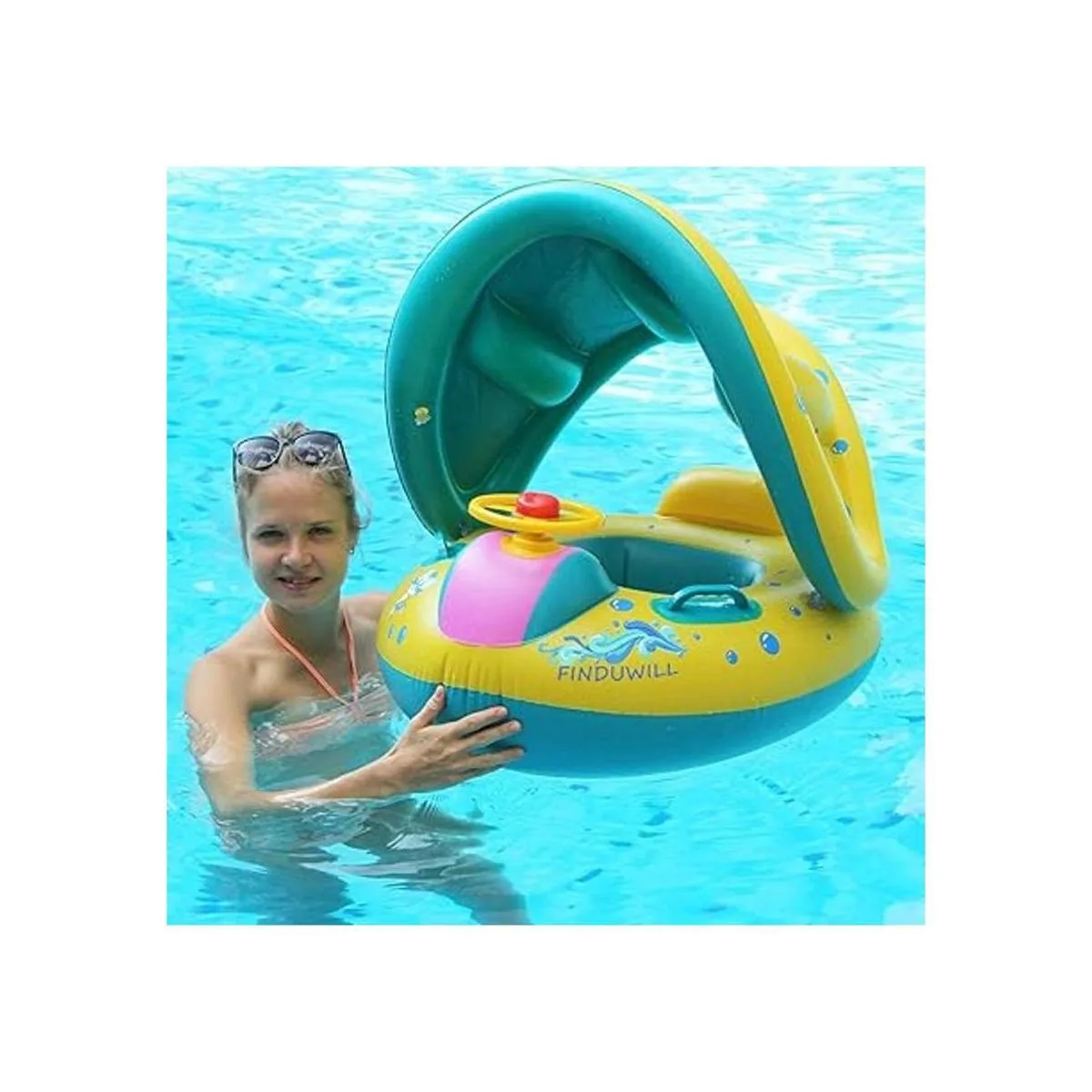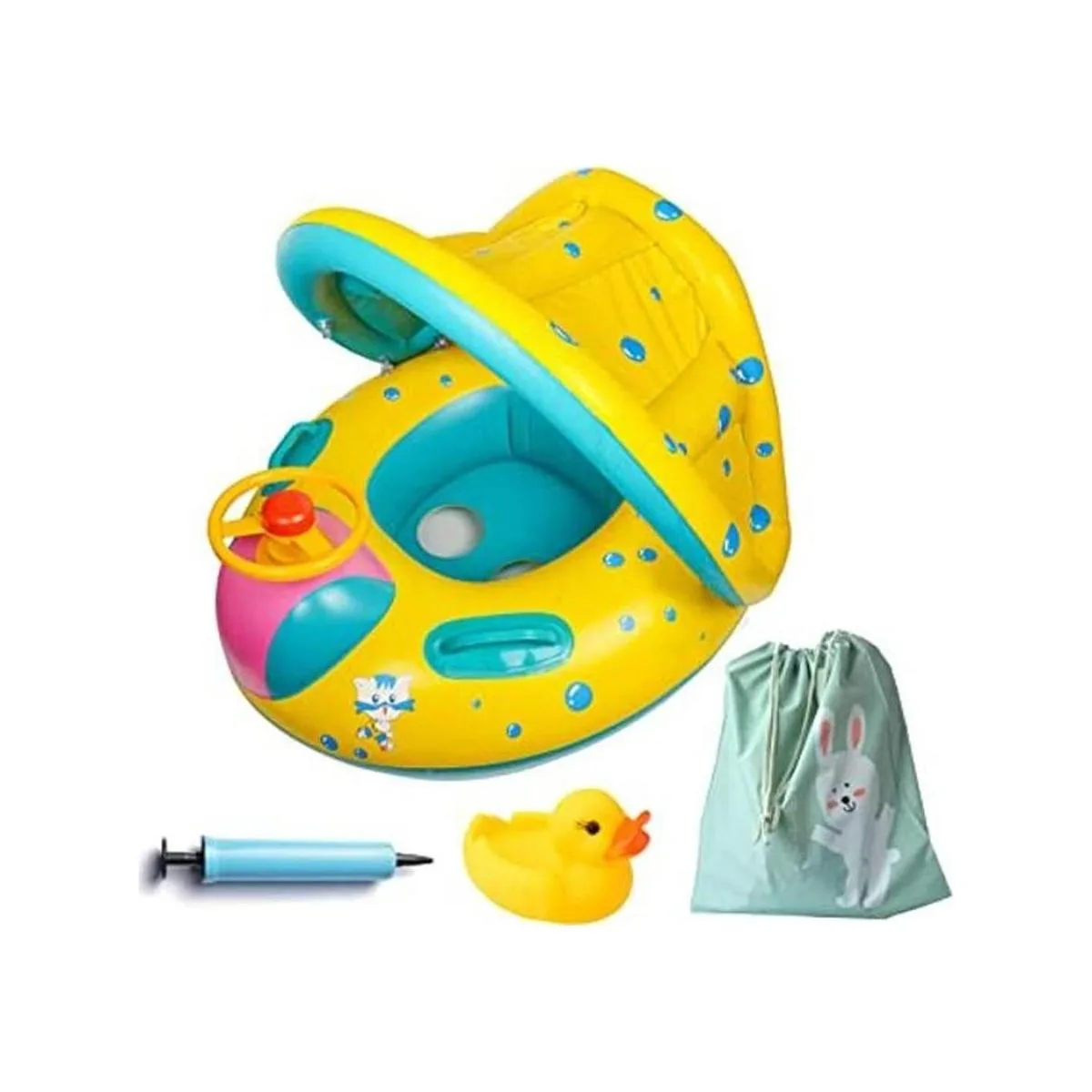 Paquete incluye Bomba inflable piscina para bebés flotador 1, 1, patito de goma juguete 4 1 bolsa de transporte, resistente al agua Material Inflable piscina para bebés flotador asiento y toldo son de madera de ambiente familiar con PVC, al inflar puede flotar en el agua fácilmente.