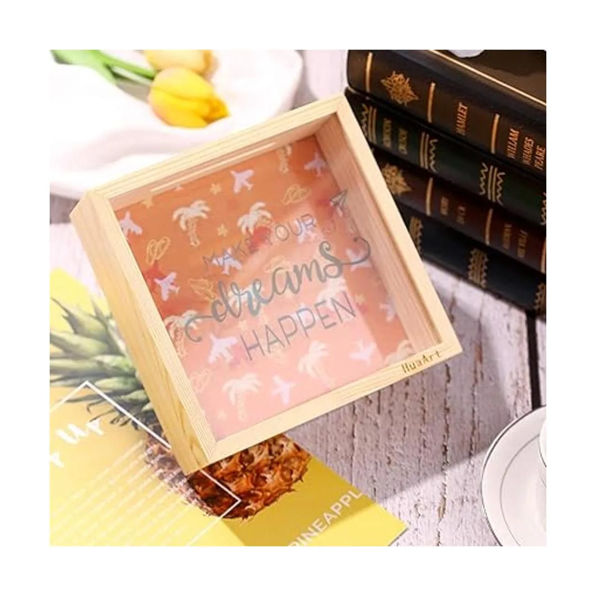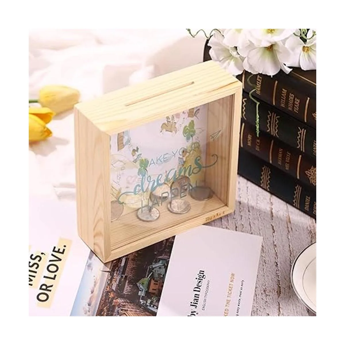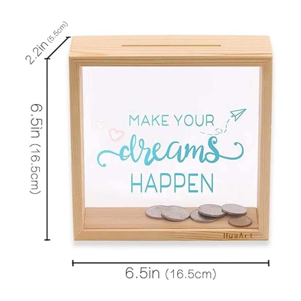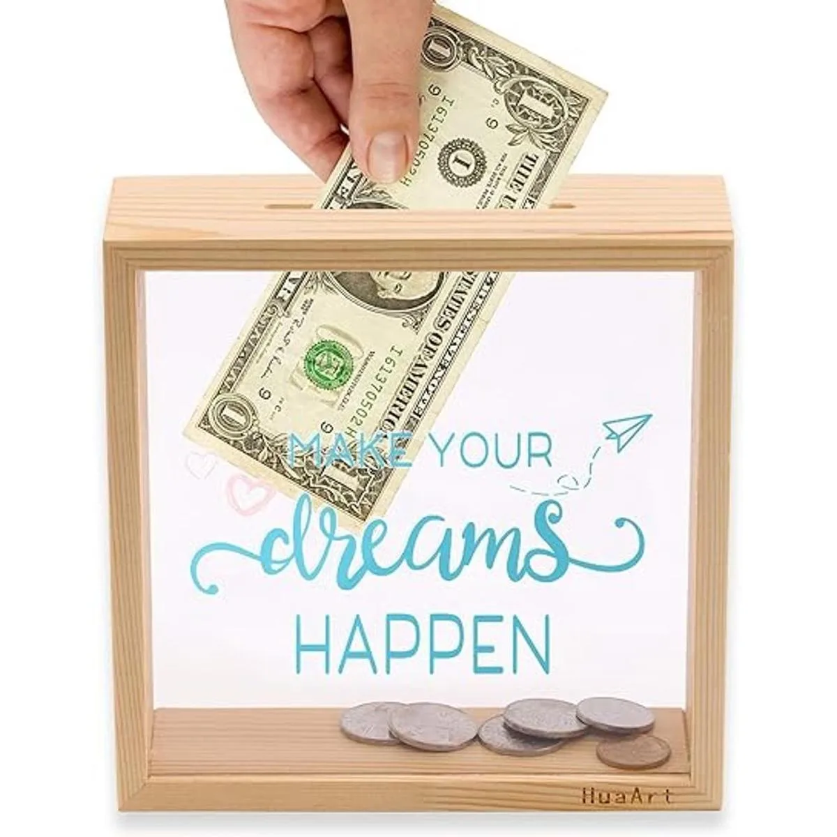 Alcancías para adultos, marco decorativo de madera, caja de sombra, caja de dinero para monedas, tamaño 6.5 x 6.5 x 2.2 pulgadas, caja de dinero de madera natural, impresa en la parte delantera de plexiglás, haz que tus sueños sucedan.