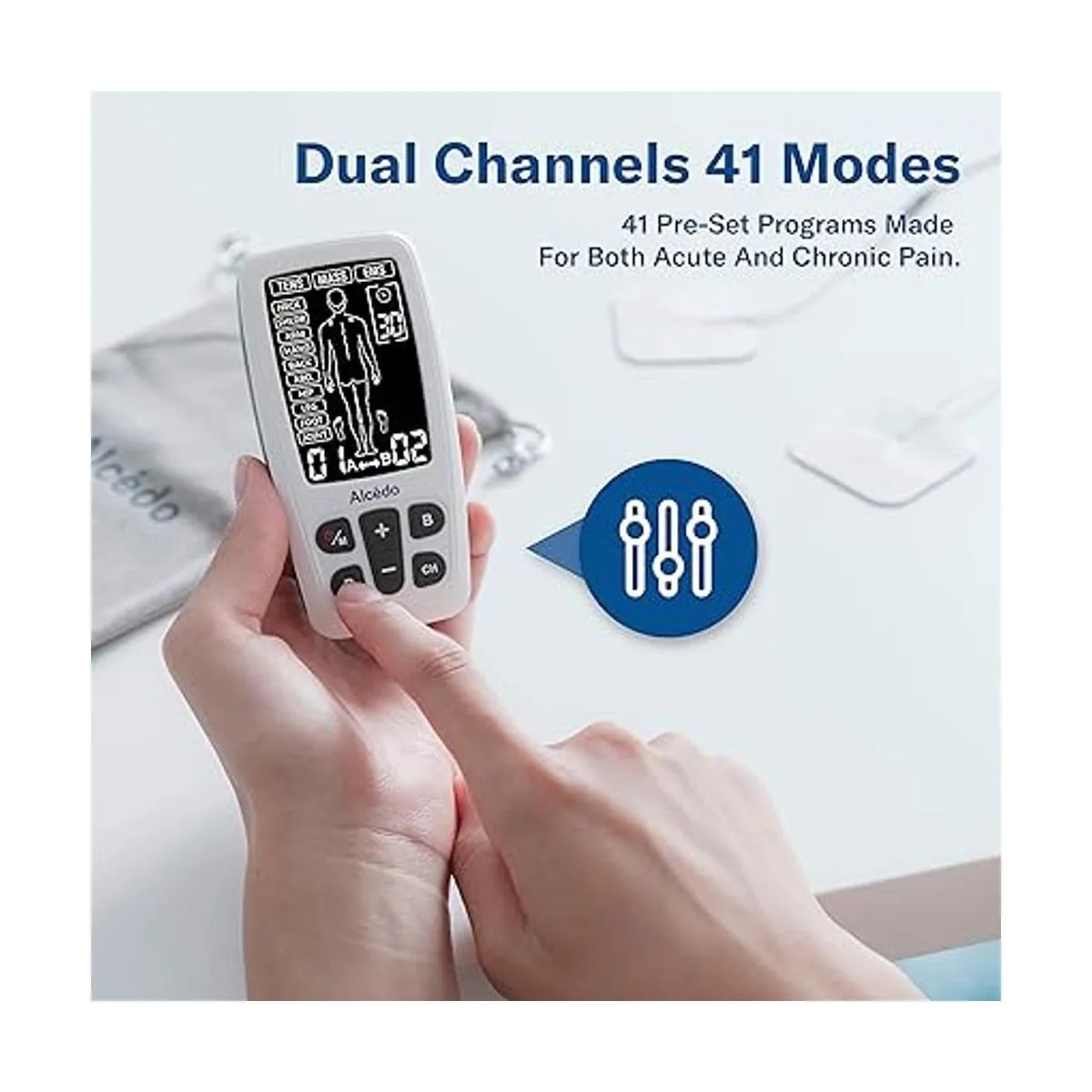 Alcedo TENS Estimulador muscular de máquina para aliviar el dolor, masajeador de pulso eléctrico recargable con 41 modos para terapia del dolor de espalda/cuello, 8 almohadillas, bolsa de almacenamiento, soporte para almohadillas