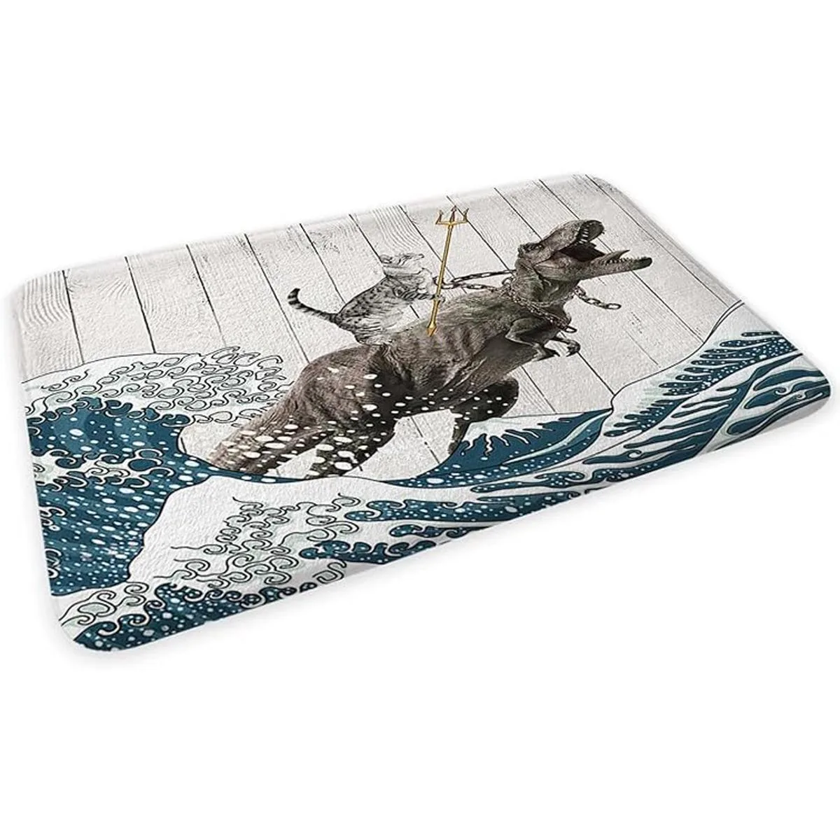 Alfombra de baño divertida para gatos, diseño de dinosaurios japoneses con ondas de océano, alfombra de baño suave, de madera rústica para granero, 24 x 16 pulgadas
