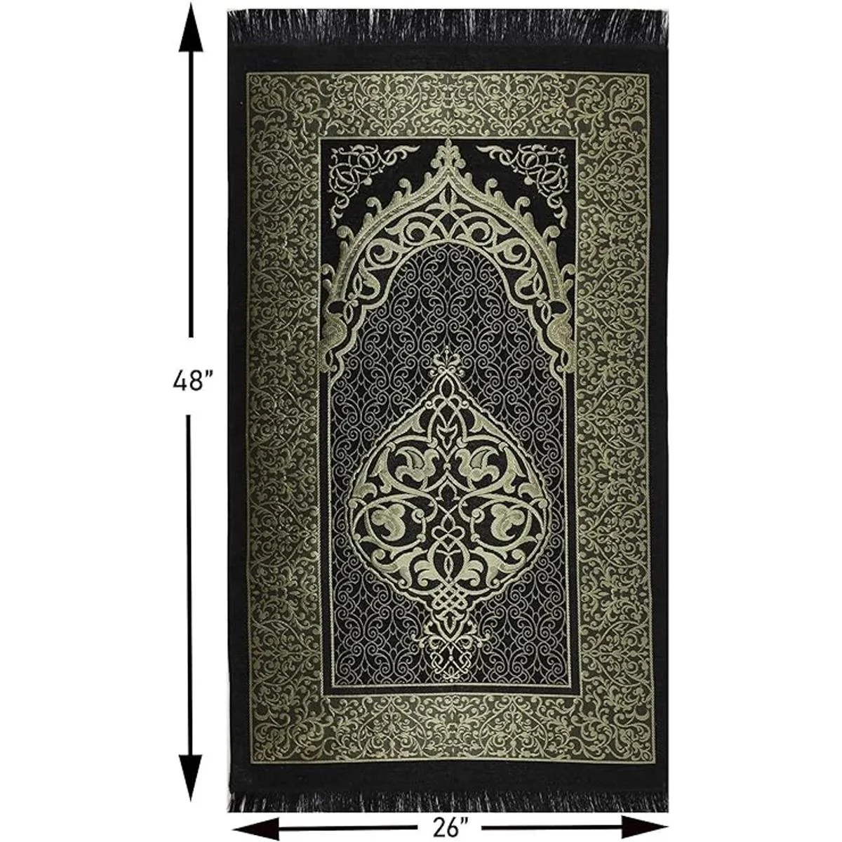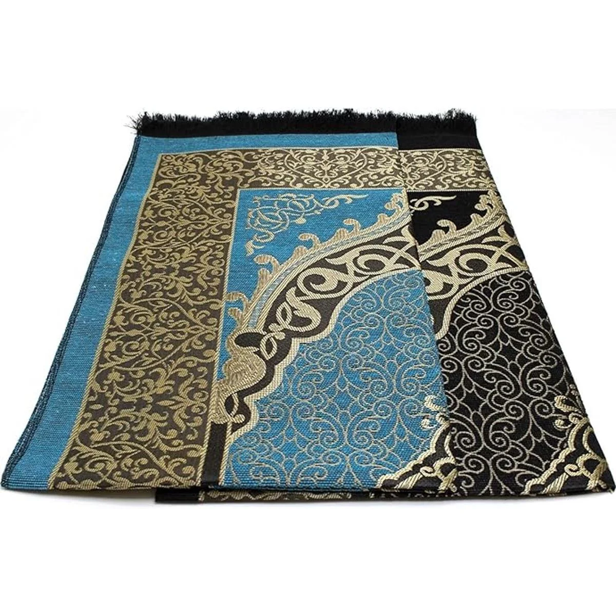 Alfombra de oración islámica fina tejida chenilla y tafetán turco Sajadah intrincado diseño otomano metálico negro azul
