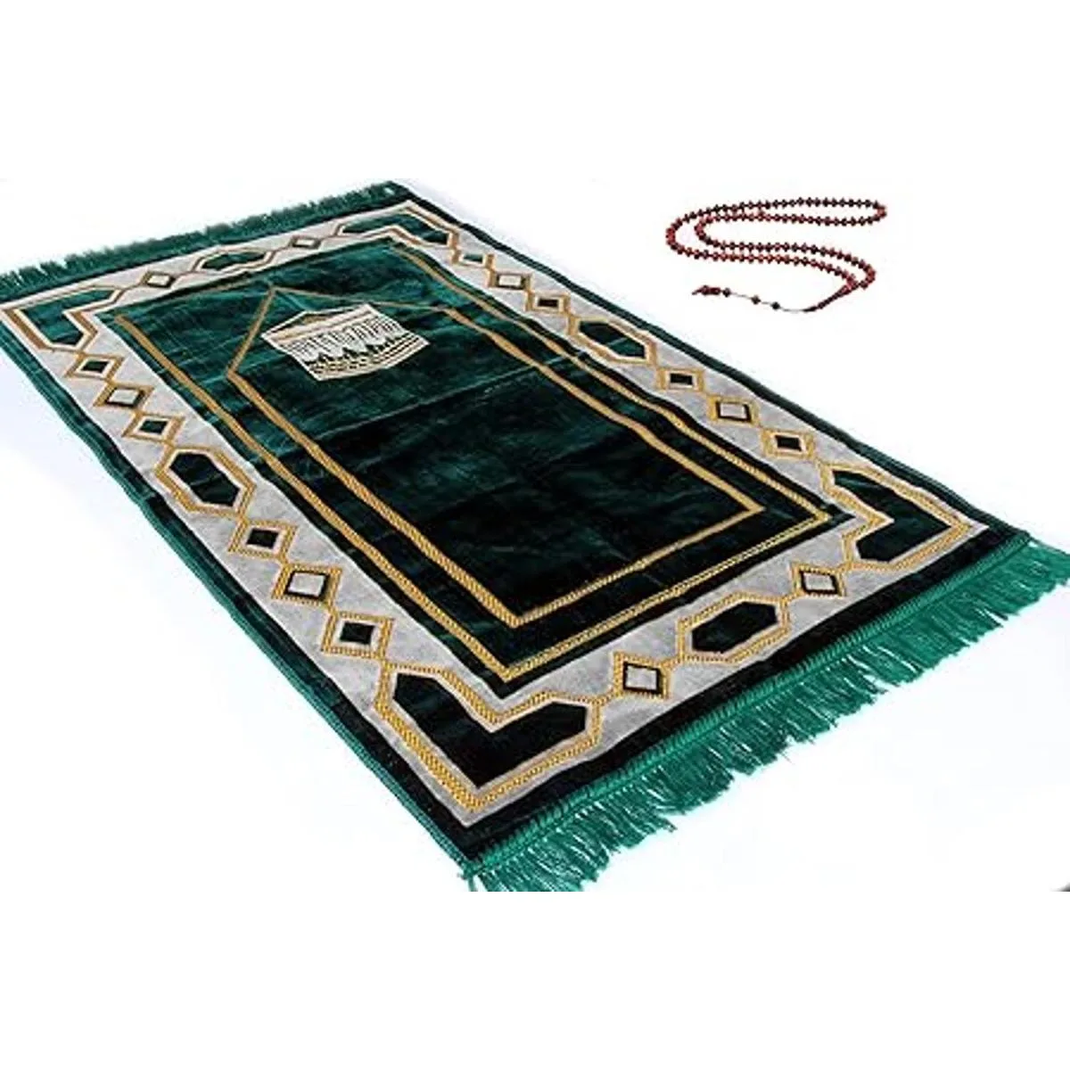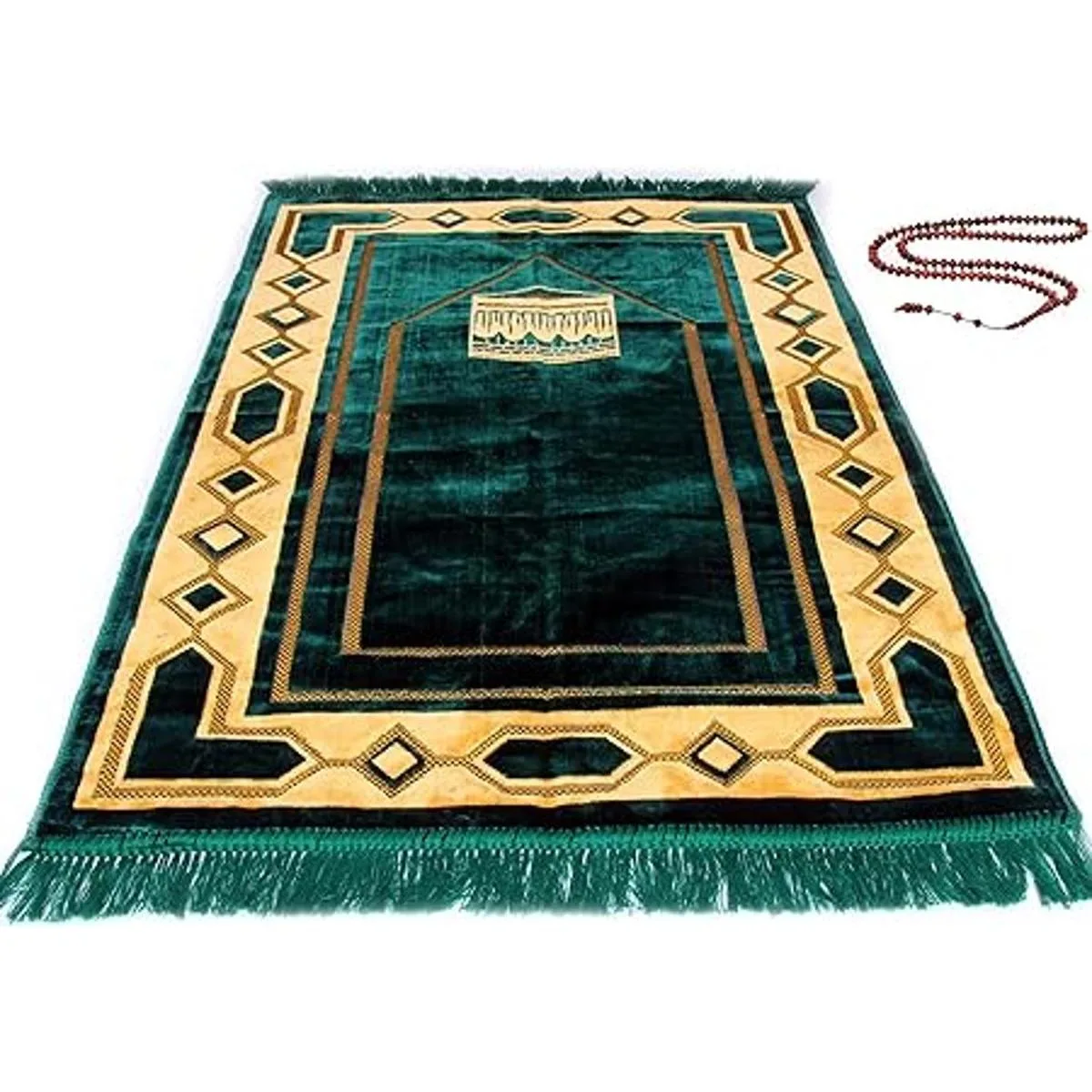Janamaz Sajjadah para musulmanes, hecho de terciopelo de felpa suave y bordado de color dorado brillante, secretado de Namaz islámico con un regalo gratuito de granos de oración TESPIH