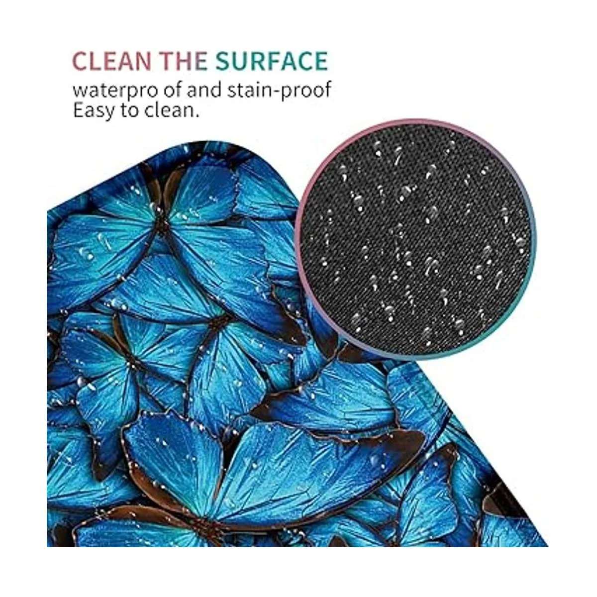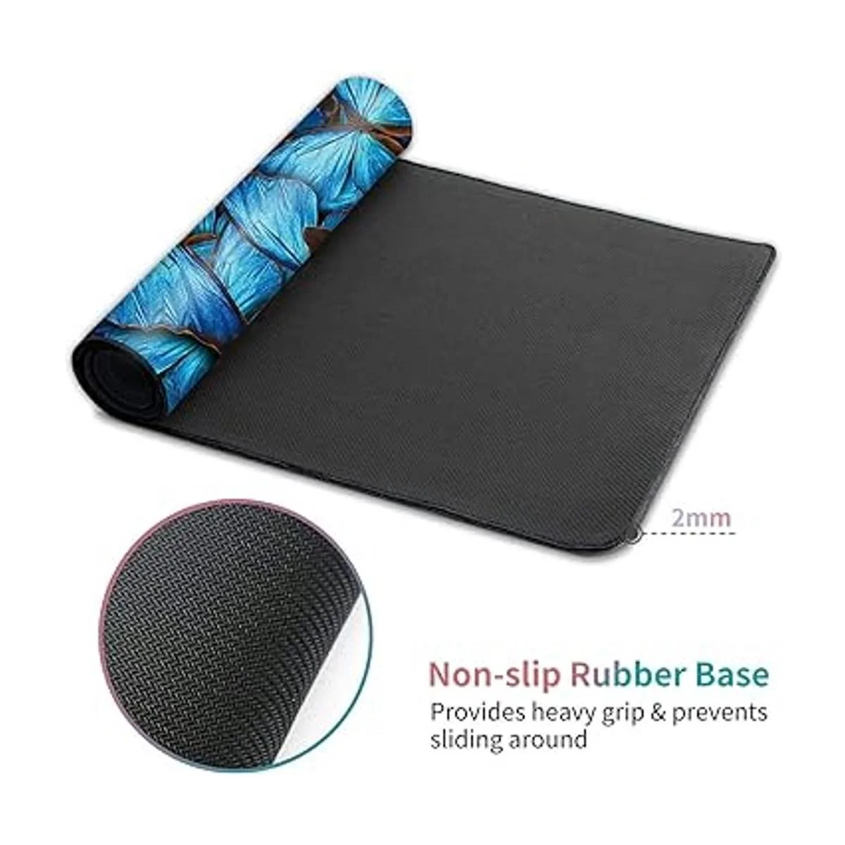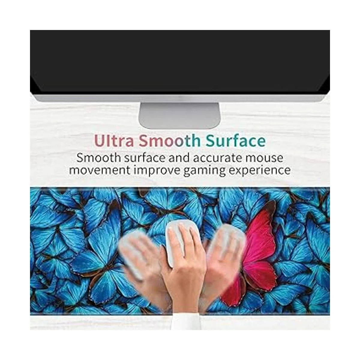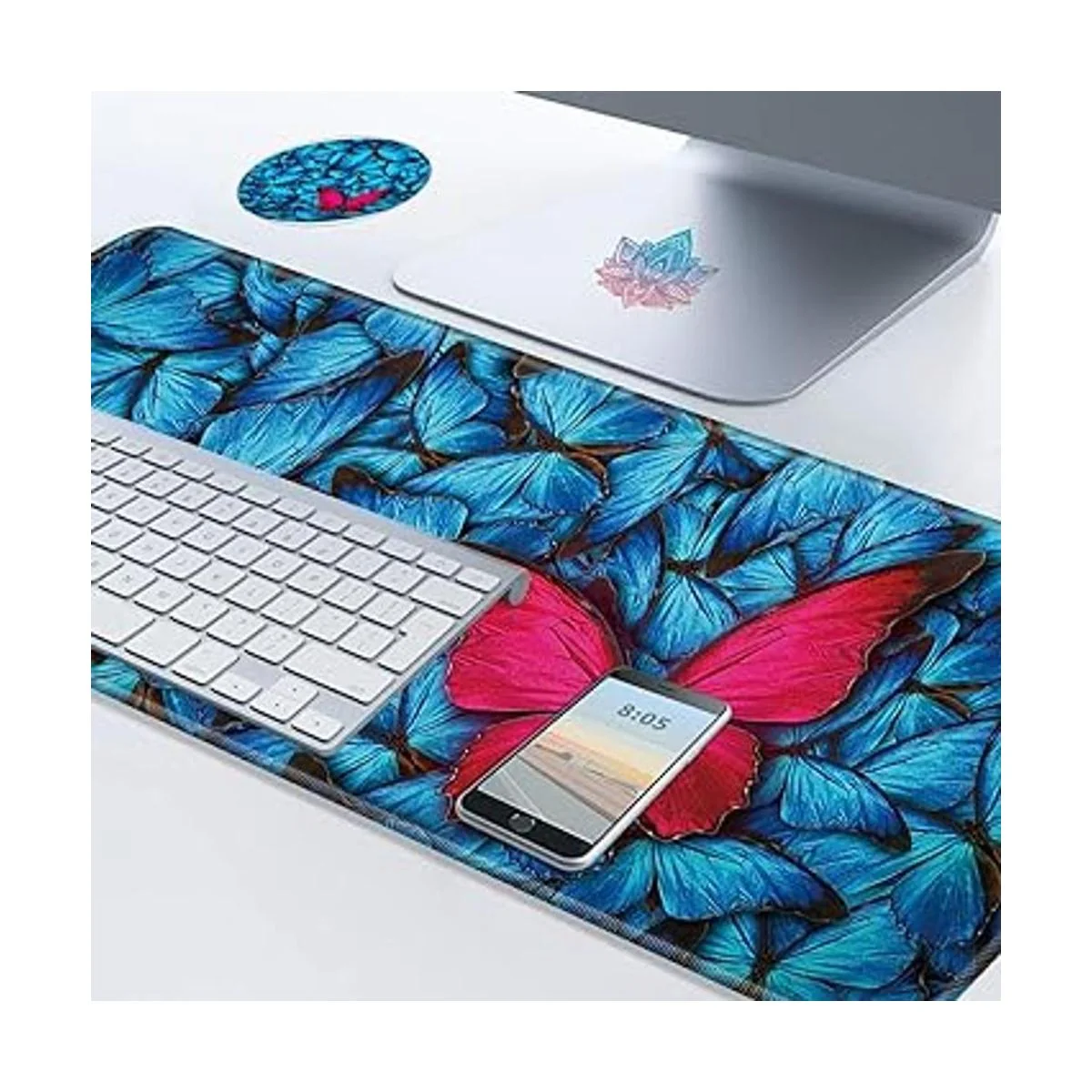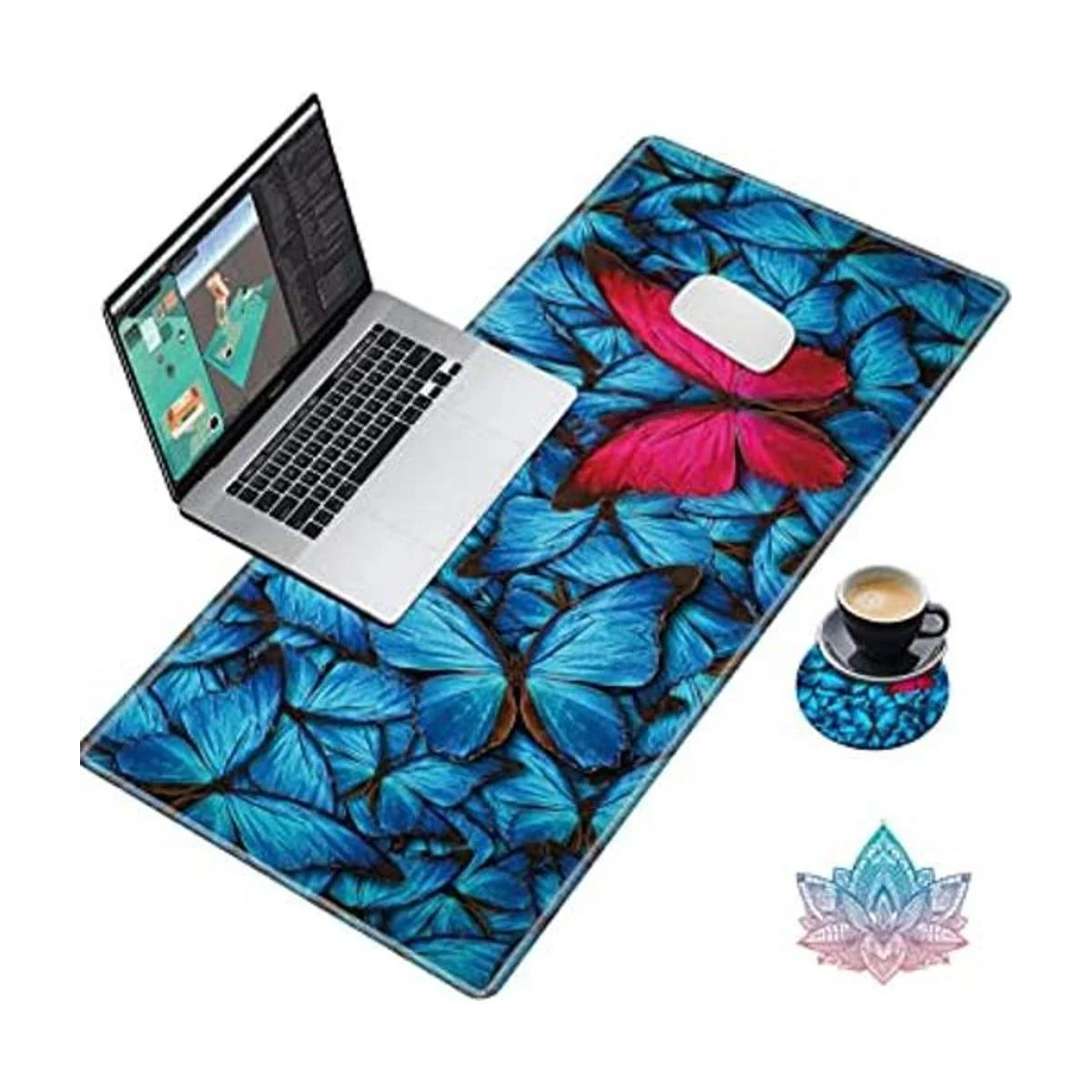Alfombrilla de escritorio grande para juegos XXL XL con bordes cosidos, base antideslizante para ordenador para trabajo y juegos, oficina y hogar, con bonitos posavasos adhesivos, mariposa azul roja