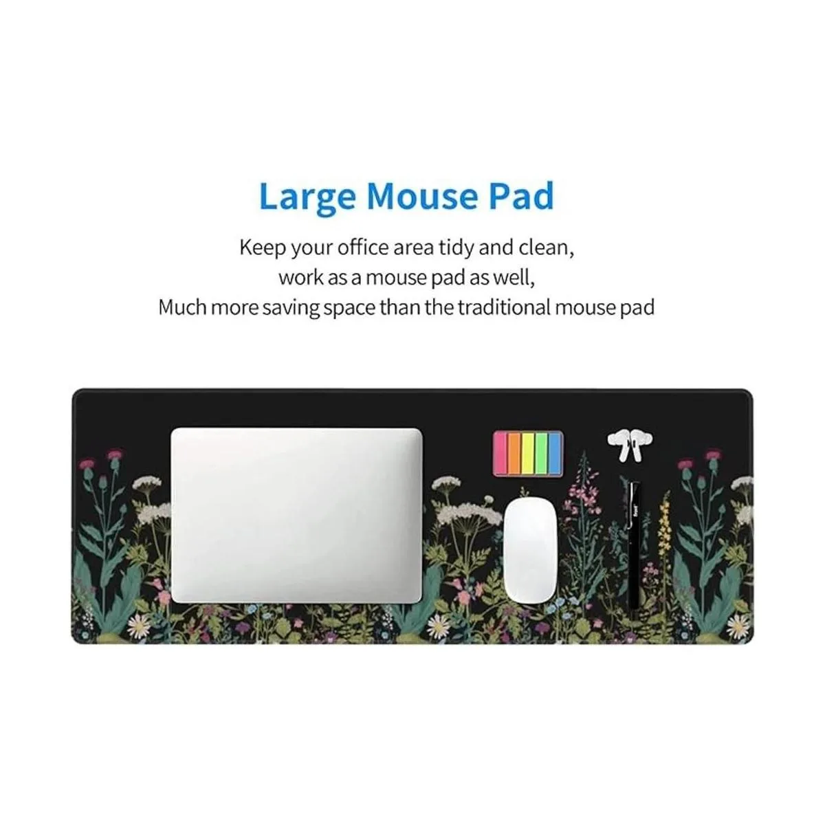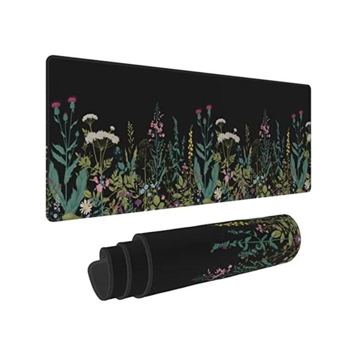 Alfombrilla de mouse grande para juegos con flores de malas hierbas, lindo regalo divertido, almohadilla de teclado grande con bordes cosidos para laptop, alfombrilla de mouse larga larga larga y antideslizante para mujer, decoración de oficina, color negro, 31.5 x 11.8 pulgadas