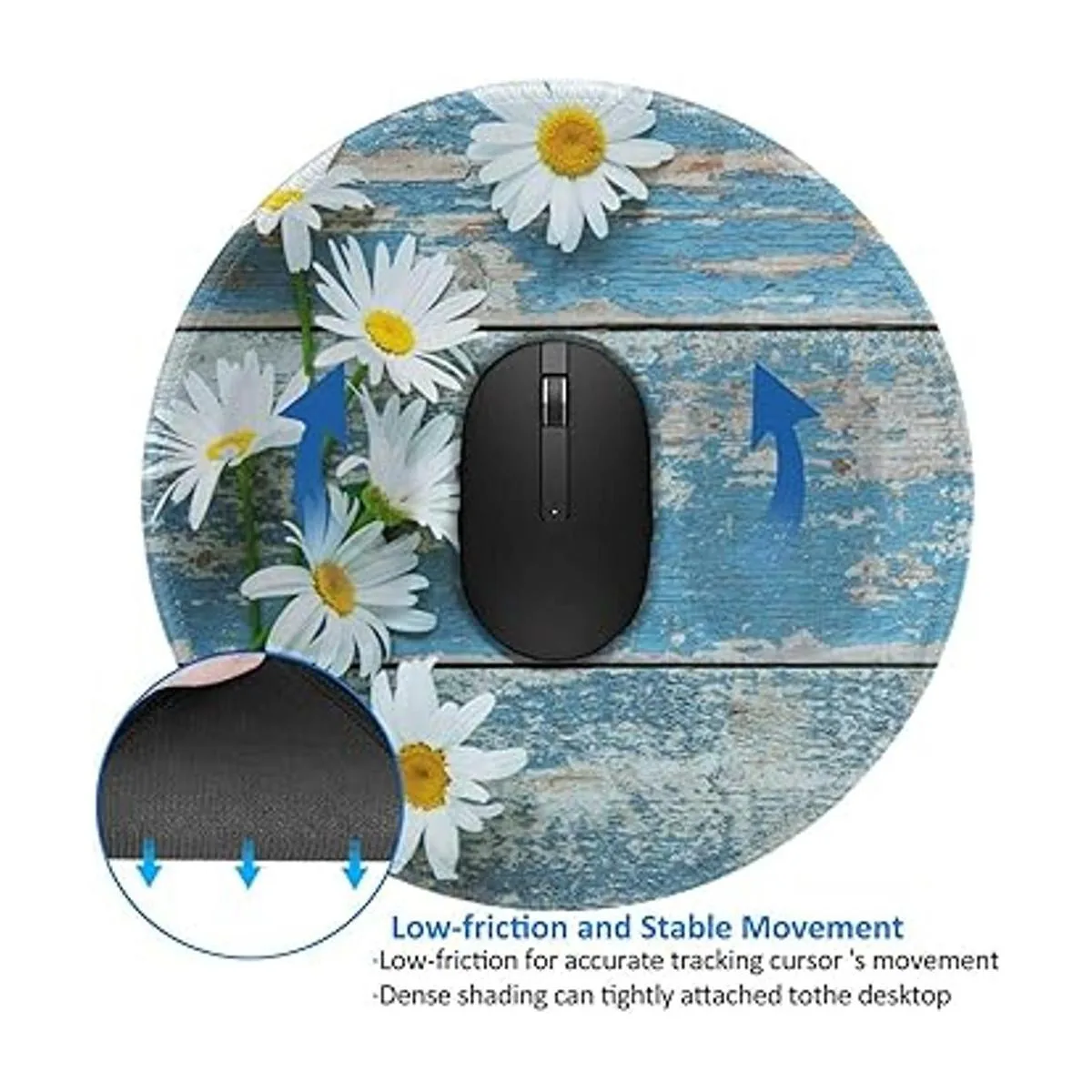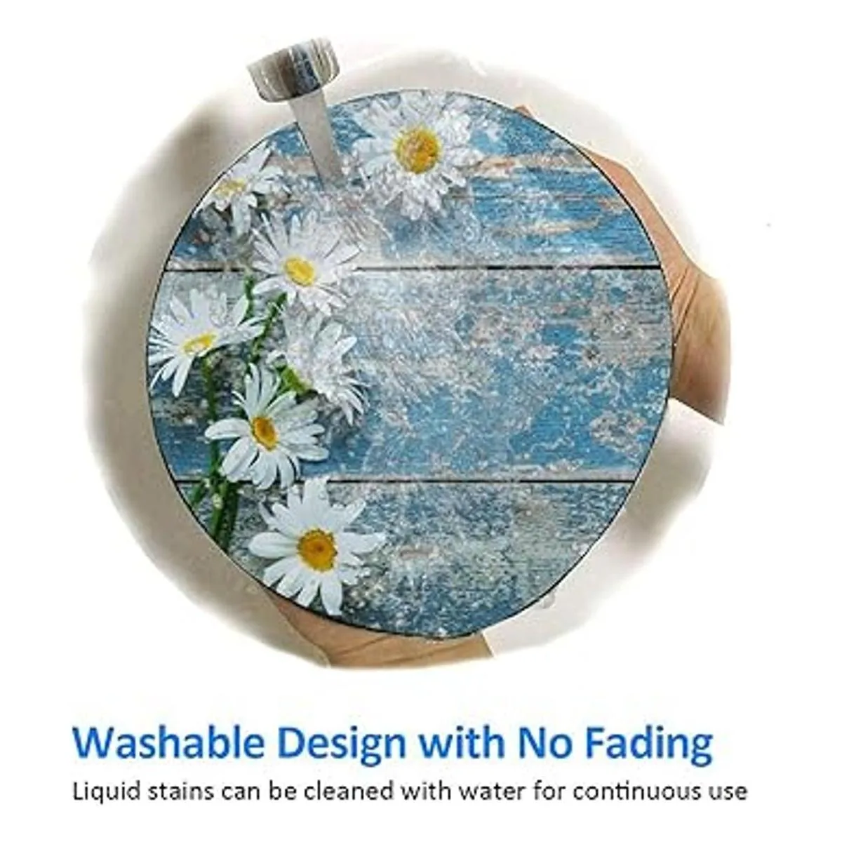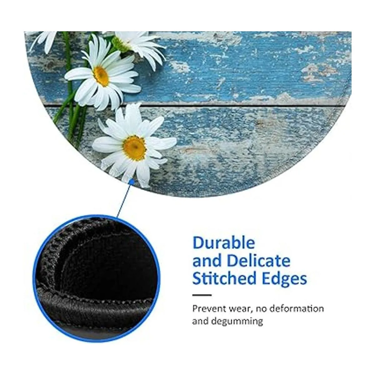 Diseño lavable y evita la decoloración. Esta alfombrilla de ratón redonda de margarita azul tiene un gran efecto de color de bloqueo. Las manchas líquidas se pueden limpiar con agua para un uso continuo. Y no se desvanece con la limpieza repetida. Lavable a máquina.