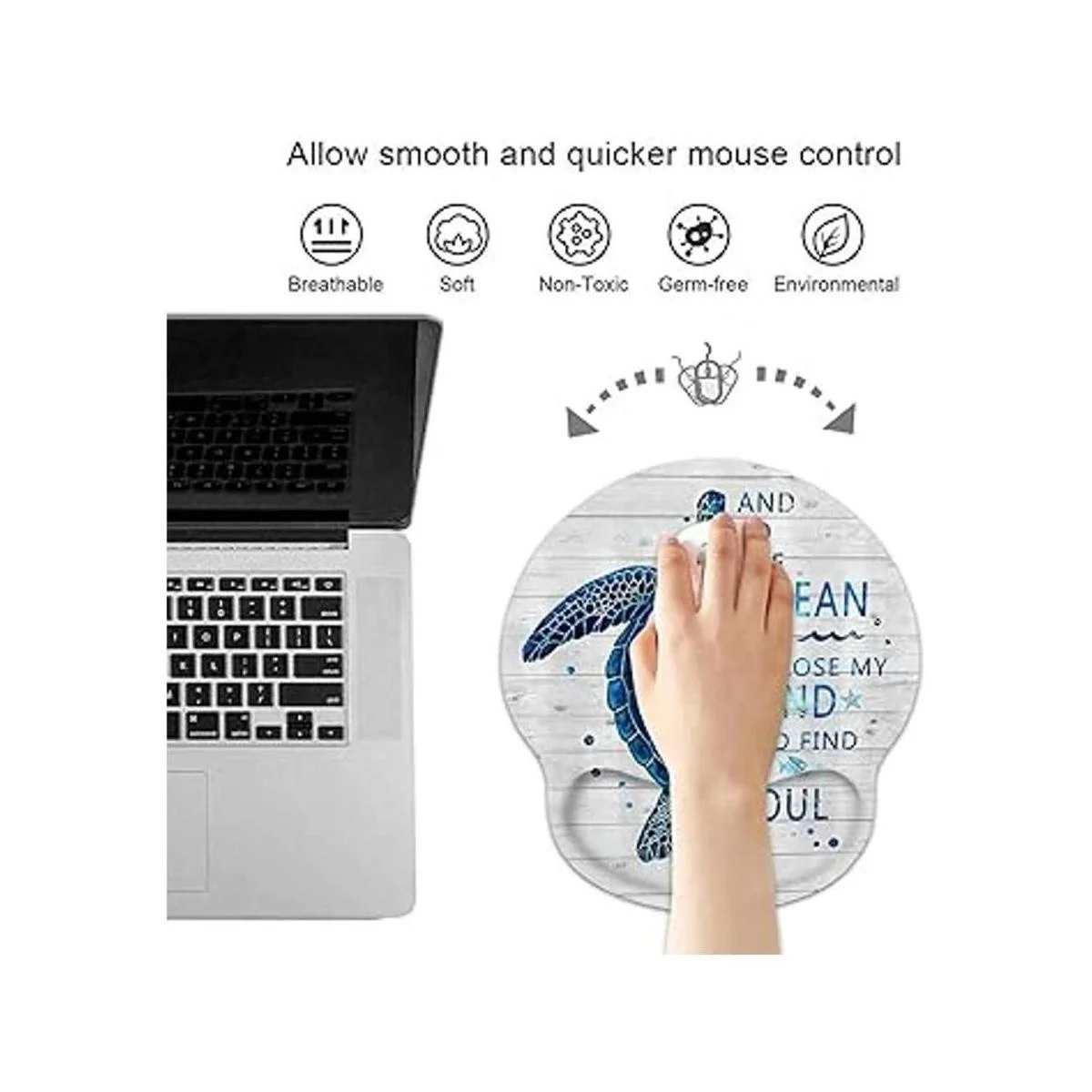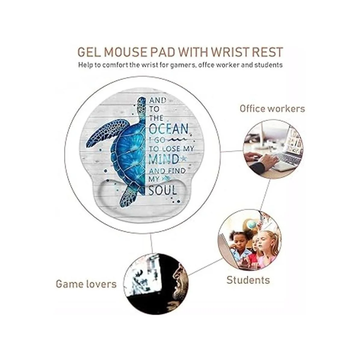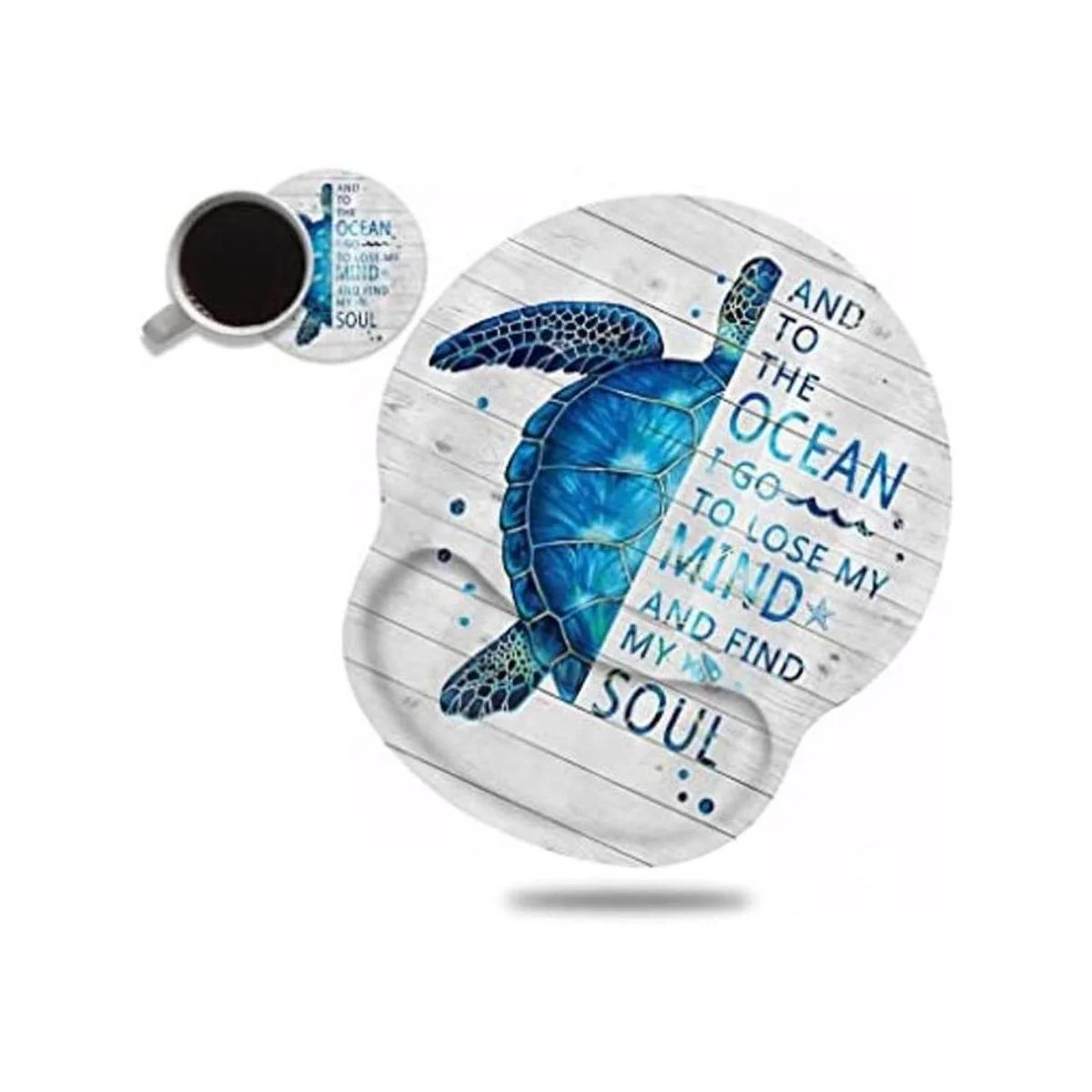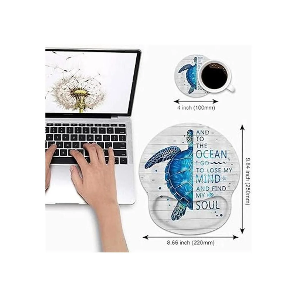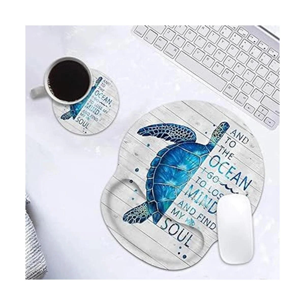 Alfombrilla de ratón ergonómica para muñeca y posavasos de café, palabras divertidas con tortuga de mar azul en madera rústica diseño de la tabla de reposamuñecas, alfombrilla de ratón, alivio del dolor para la muñeca, alfombrilla de ratón para ordenador portátil, hogar oficina