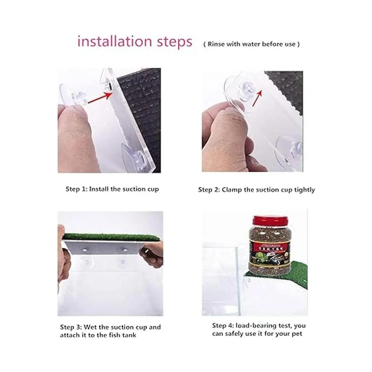 Nota: el peso máximo de nuestra terraza de tortuga es de aproximadamente 2.8 lbs. Asegúrate de fijar la ventosa a una superficie lisa de vidrio o acrílico. Cuando se utiliza, mantén la superficie limpia, puedes rociar un poco de agua en la ventosa de acuerdo a la situación real y exprimir el exceso de aire en la ventosa.