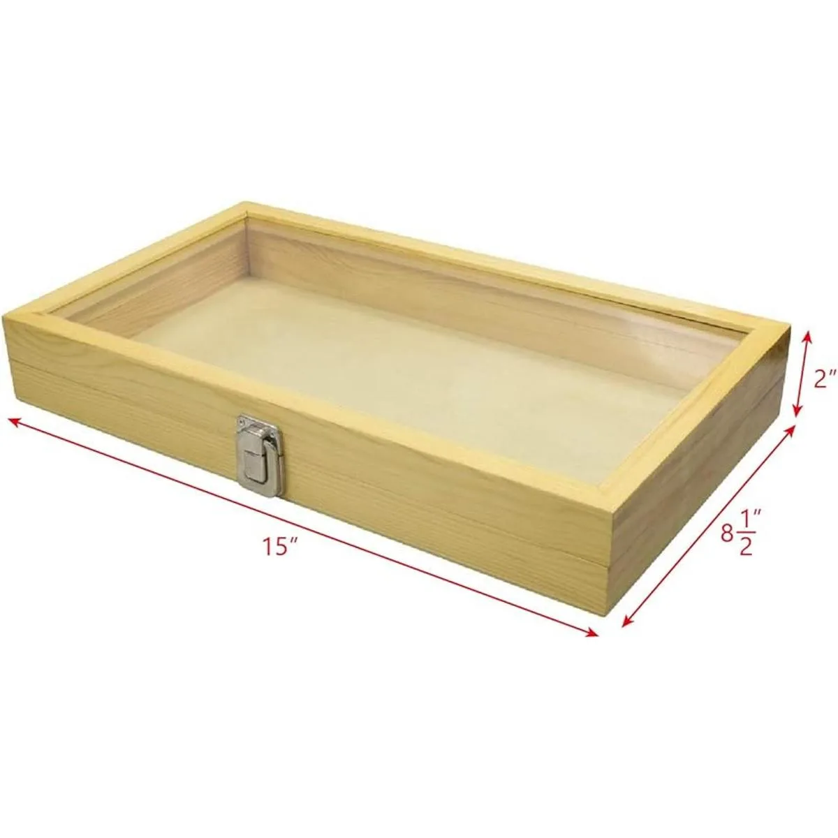 1 1/2 pulgadas de altura interior desde la parte inferior de la caja exhibidora de joyería o cuchillo a la tapa de vidrio.