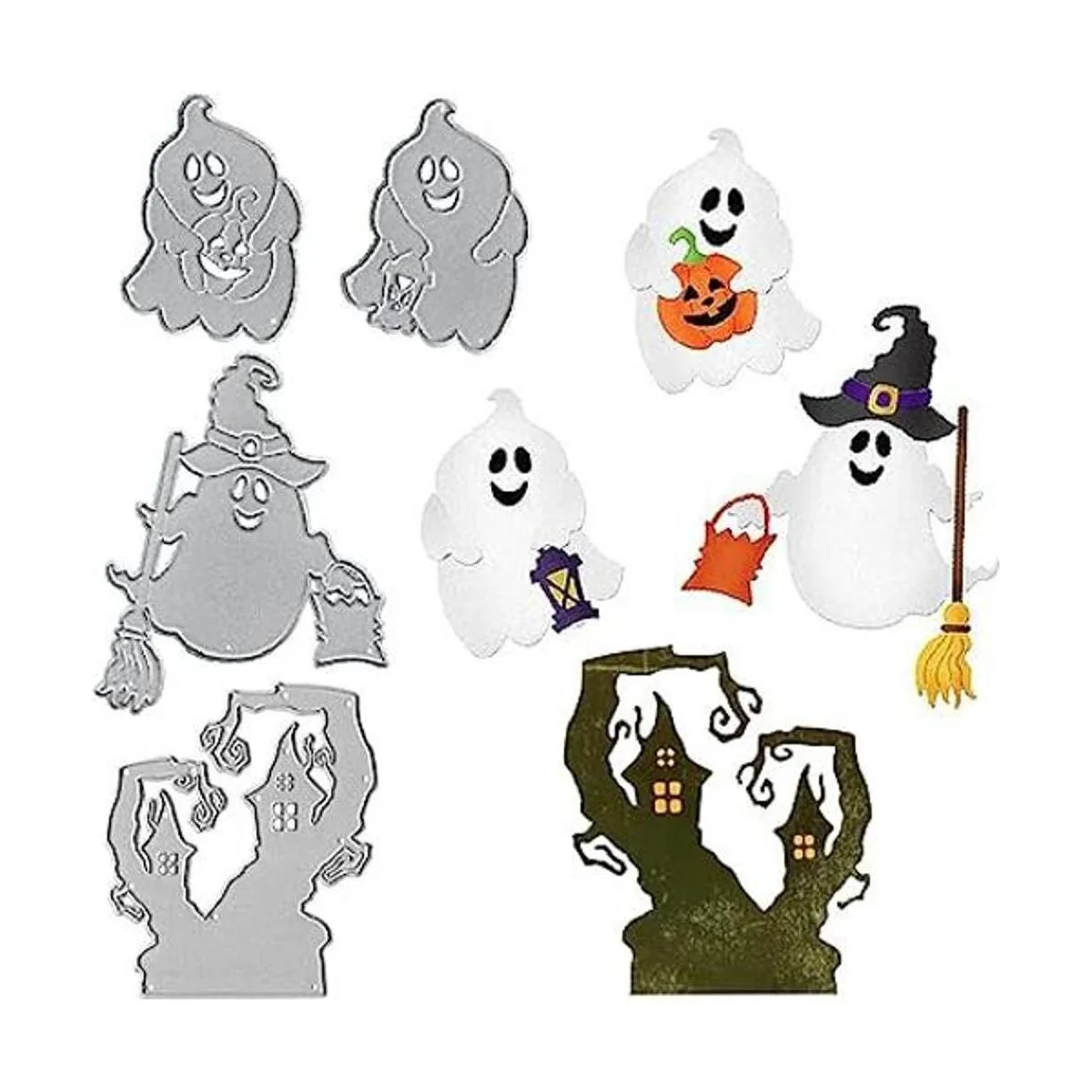 ALIBBON 2 troqueles de Halloween para hacer tarjetas y álbumes de recortes, troqueles de corte de castillo de Halloween, moldes de plantilla de metal, troqueles de bruja fantasma para álbum de fotos de bricolaje, decoración de papel en relieve
