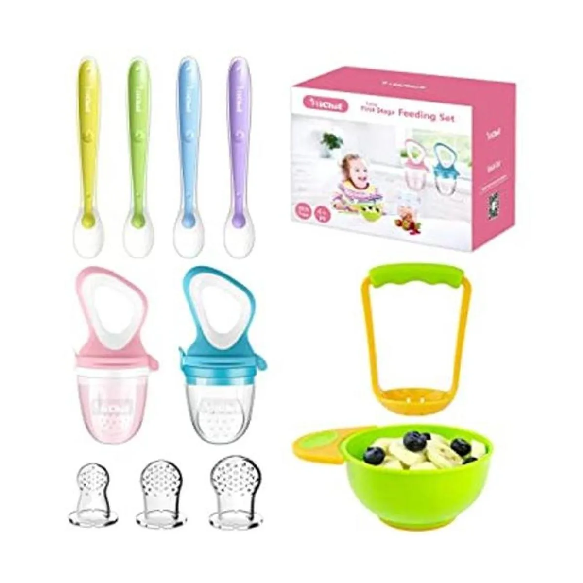 Juego completo de alimentación de primera etapa para bebé: Cada juego viene completo con 2 recipientes de comida para bebé con 3 saquitos de silicón de repuesto de diferentes tamaños que te permiten intercambiar cómodamente los chupetes de silicón e insertar más alimentos a medida que tu bebé crece. También incluye un machacador y un cuenco para servir y 4 cucharas de silicón de punta suave para las encías sensibles del bebé, lo que significa que puedes triturar la comida fácilmente y servirla todo en un cuenco cuando empieces a usar sólidos. Regalo perfecto para baby shower