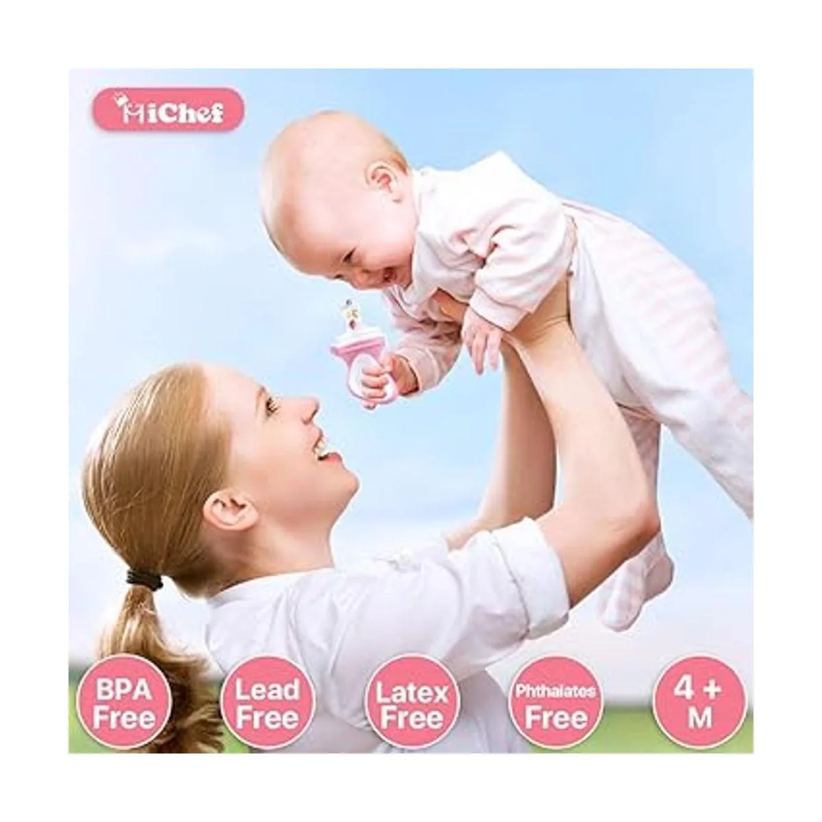 La seguridad de tu bebé es nuestra prioridad: El compromiso de MICHEF con la seguridad del producto garantiza que nuestros alimentadores de frutas y cucharas de bebé están hechos de silicón alimentario de la más alta calidad, libre de BPA, plomo y ftalatos, por lo que puedes estar seguro de que tu bebé está a salvo de productos químicos nocivos