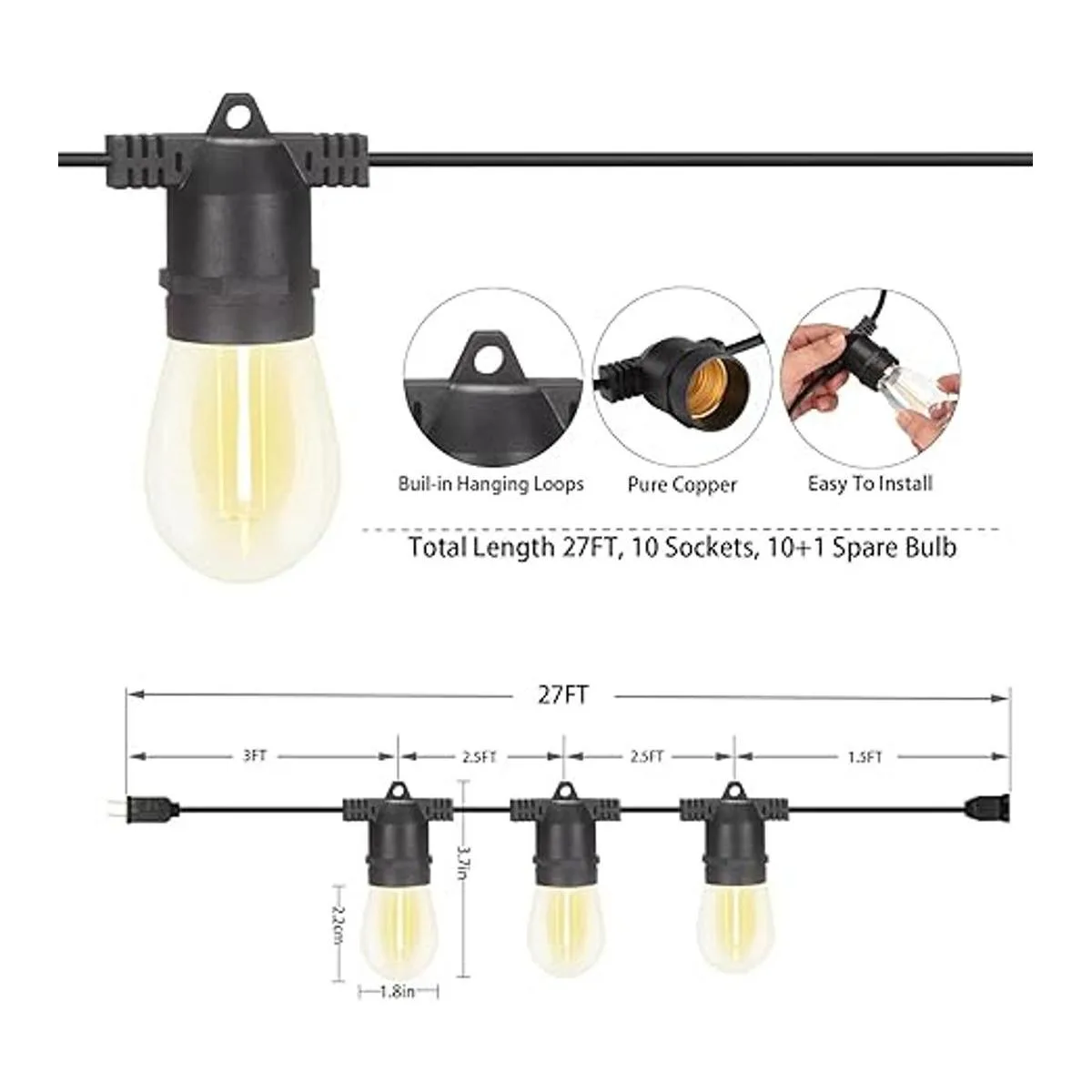 Conectables y fáciles de instalar: Cada serie de luces colgantes para exteriores contiene 10 sockets colgantes basados en E26, provistos de focos LED S14 de 1 W 10. La distancia entre los focos es de aproximadamente 2.5 pies. Se pueden conectar, de extremo a extremo, hasta 34 juegos de estas series de luces Edison, lo que es lo suficientemente largo para todo tipo de actividades. Los lazos colgantes integrados de 0.25 pulgadas son prácticos para usar con ganchos, cables de guía, bridas o clavos de tornillo para colgar perfectamente las series de luces para patios.