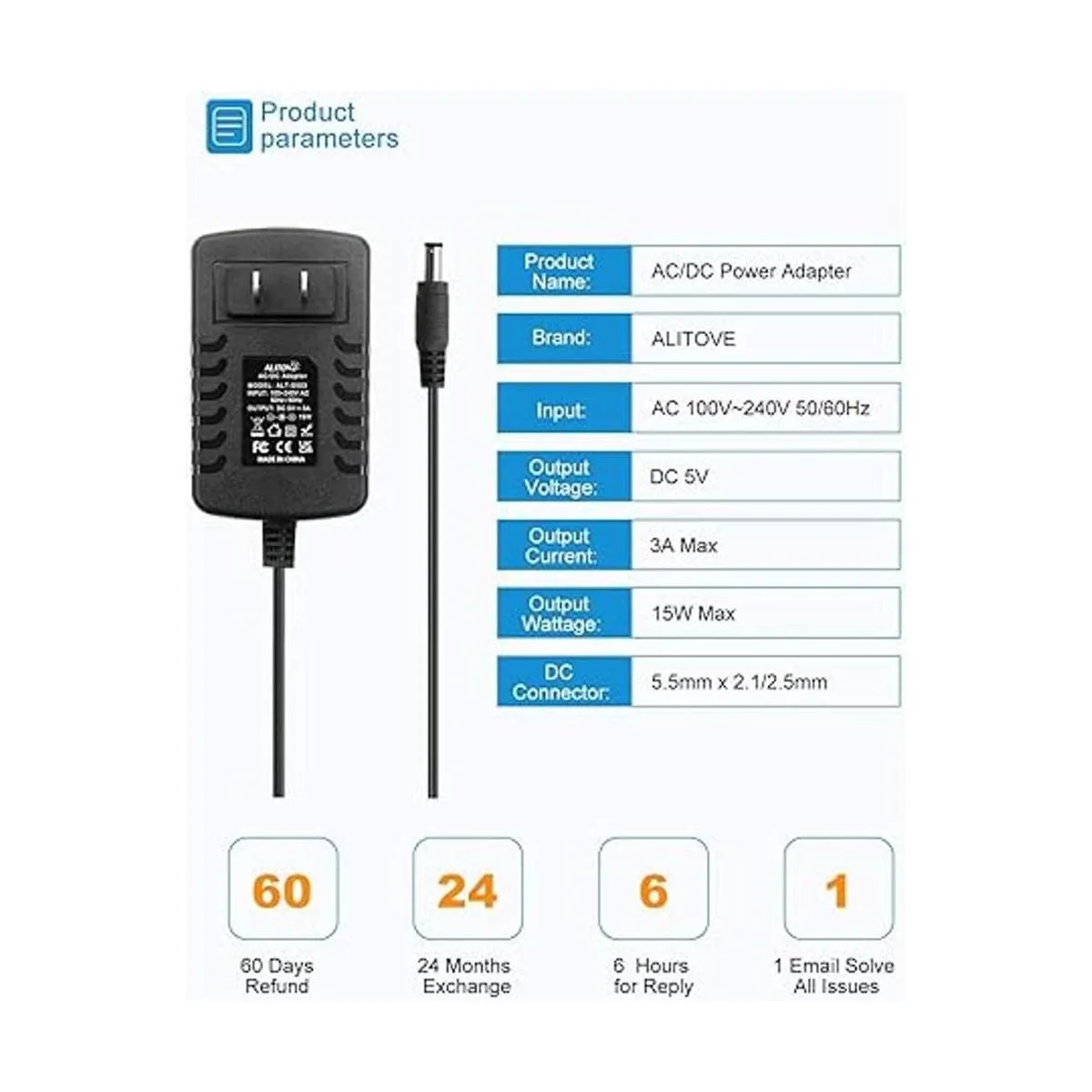 Entrada: 100 V240 V 50/60 Hz; Salida: 5 V CC hasta 3 amperios; Tamaño del conector adaptador de salida: 0.217 in x 0.098 in, compatible con 0.217 in x 0.083 in