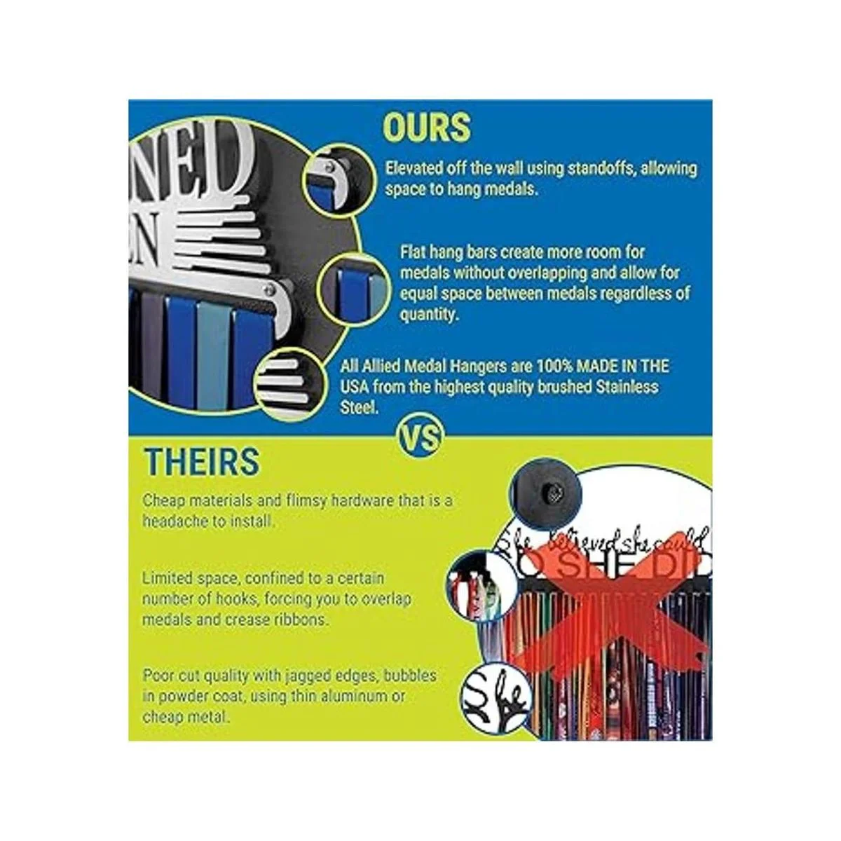Acabado de alta calidad: los ganchos de medallas Allied están cortados de acero inoxidable cepillado de la más alta calidad con un láser de precisión de alta potencia que nos permite lograr detalles impresionantes en nuestros diseños. Hemos estado vendiendo nuestros ganchos de medallas durante más de 10 años y hemos recibido miles de comentarios de clientes como tú que están encantados de que su colgador haya resistido la prueba del tiempo y el peso de muchas medallas. El costo de nuestras perchas proviene directamente de la calidad de nuestros productos