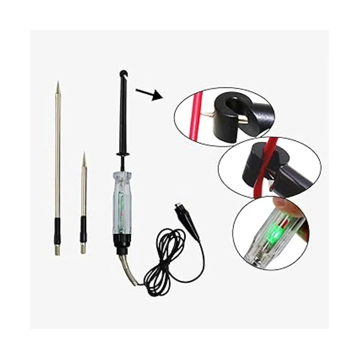 ALLOSUN GK5225 Probador de sonda de gancho de 6 V12 V, cable de 59 pulgadas con indicador LED y zumbador, color blanco
