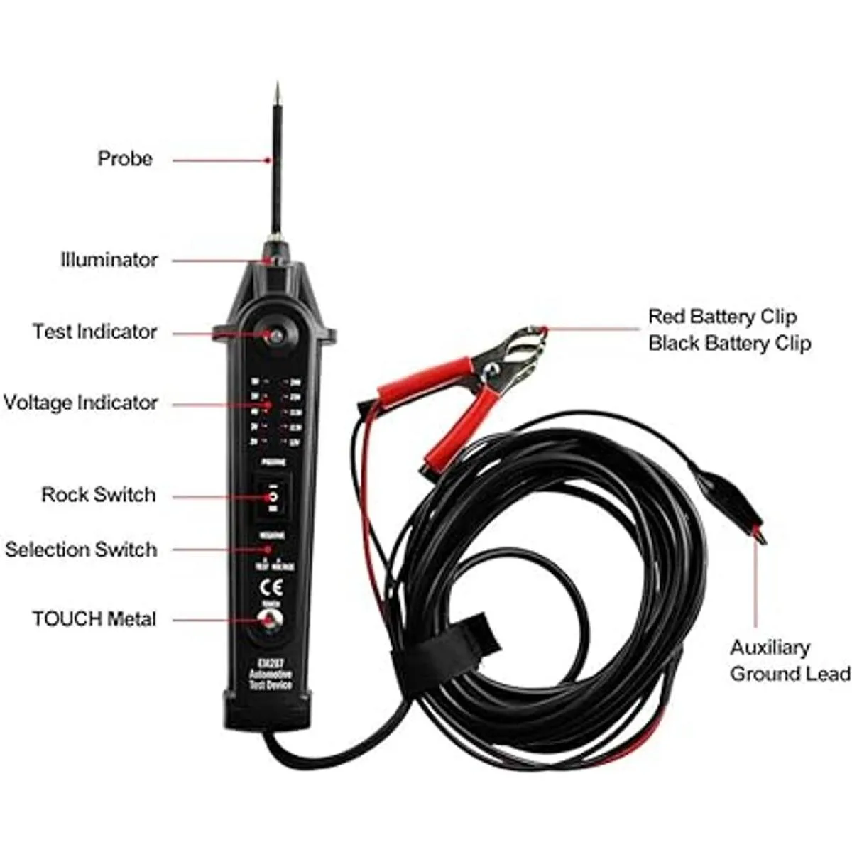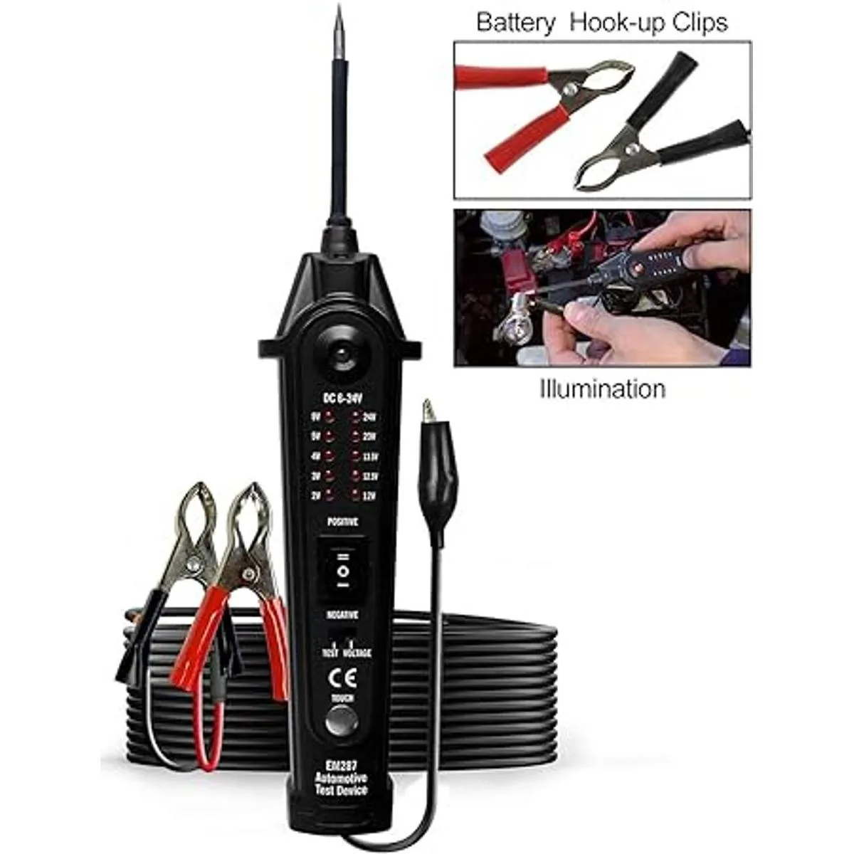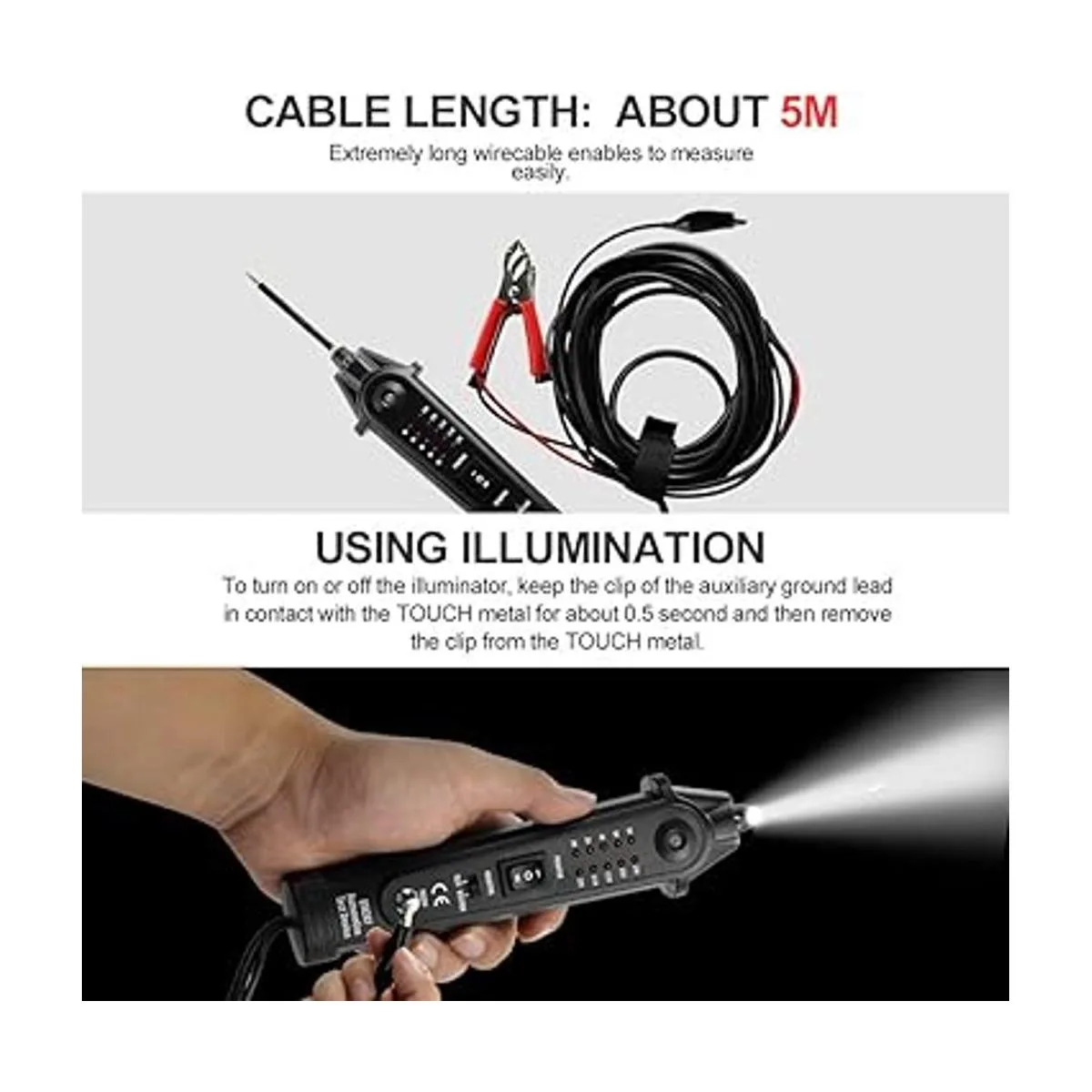 Fácil de usar. Alimentado por la batería del vehículo directamente. La función de iluminación permite al técnico automotriz probar el sistema eléctrico en la oscuridad.