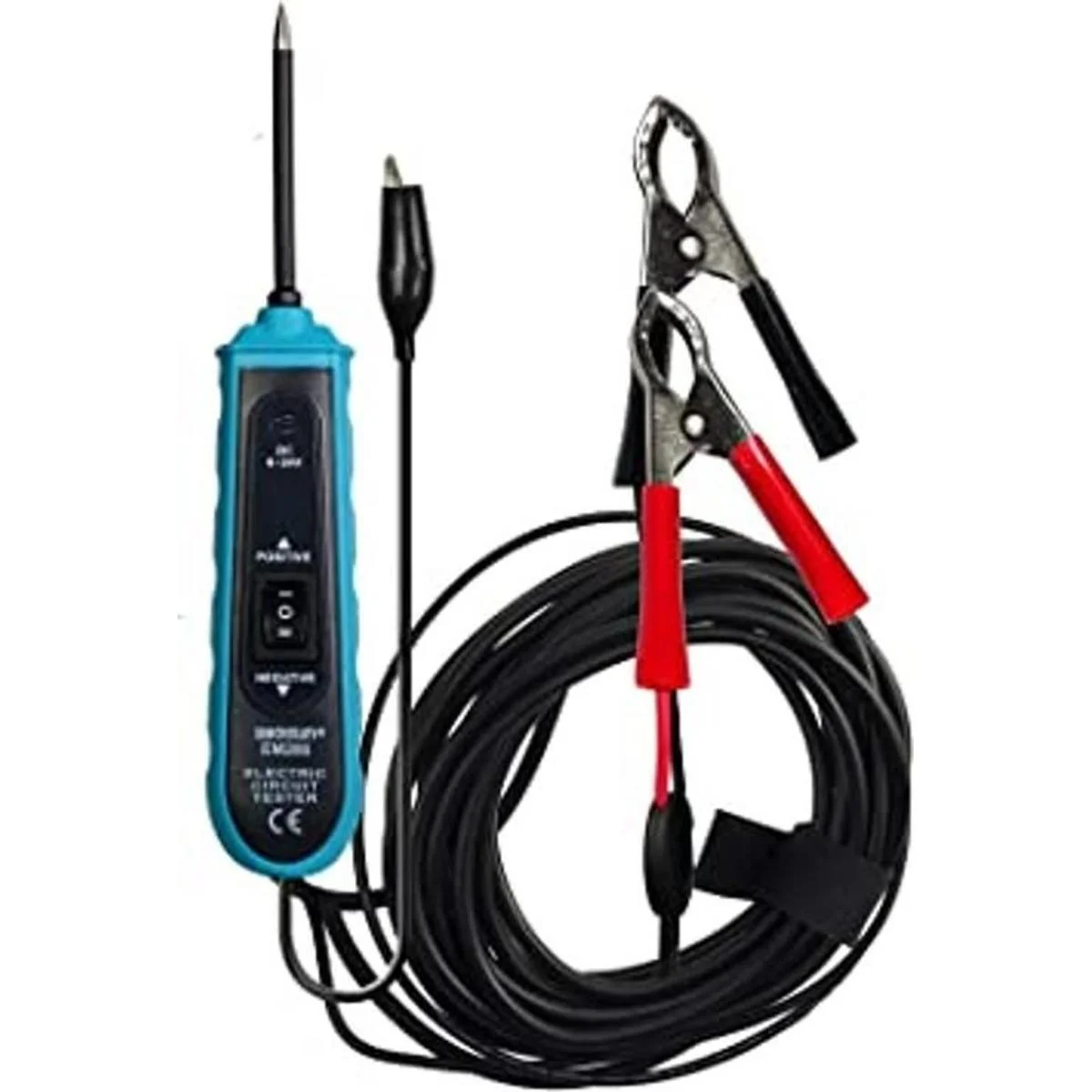 Hace que tus pruebas sean fáciles El probador de circuito EM285 tiene cable largo, es un kit completo de prueba de 6 a 24 V CC. Después de una simple conexión de la unidad a la batería del vehículo, el técnico automotriz puede conducir una corriente de batería positiva o negativa a la punta balanceando el interruptor hacia adelante o hacia atrás.