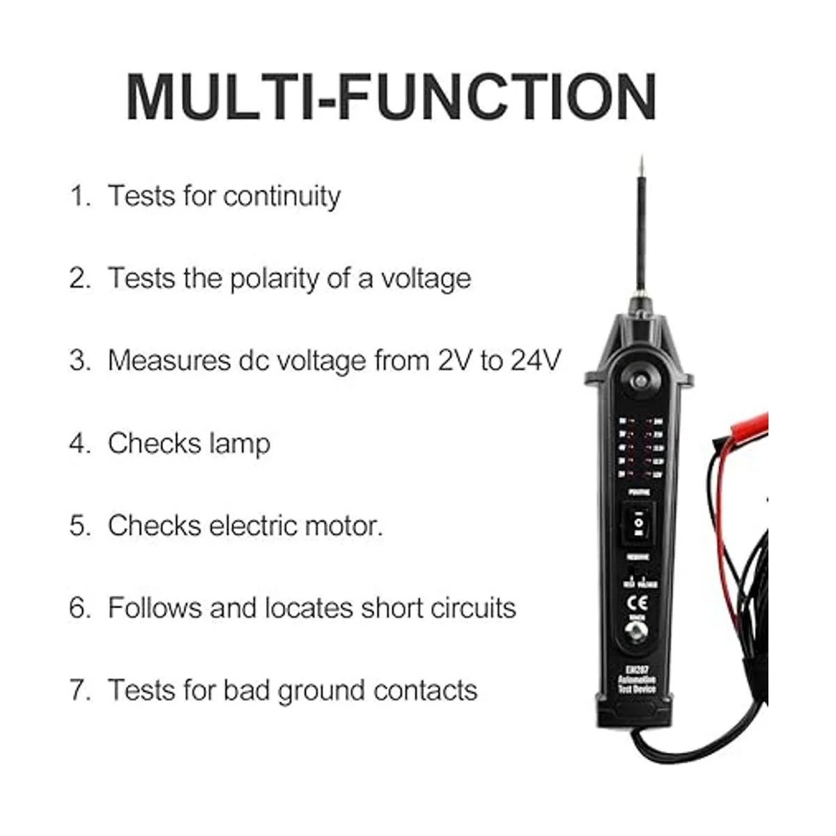 Probador de circuitos de amplia aplicación: el probador de circuito eléctrico de alimentación automotriz EM287 se puede utilizar para probar continuidad, probar la polaridad de un voltaje, comprobar la lámpara, comprobar el motor eléctrico, seguir y localizar cortocircuitos, probar los malos contactos a tierra y medir el voltaje CC de 2 V a 24 V, etc.