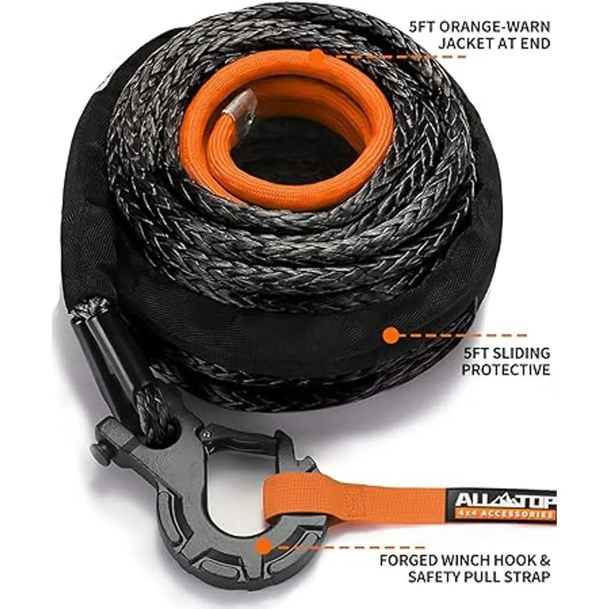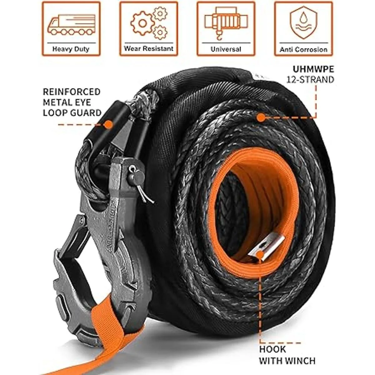 Gancho de cabrestante forjado: acero totalmente forjado tratado con calor, proporciona una resistencia irrompible de 35500 libras para tus equipos de recuperación. La superficie está tratada con revestimientos E avanzados y revestimientos de polvo adicionales para mejorar la durabilidad y ciclos de uso más largos. El gancho del cabrestante se vende con este kit de cuerda de cabrestante, también disponible por separado