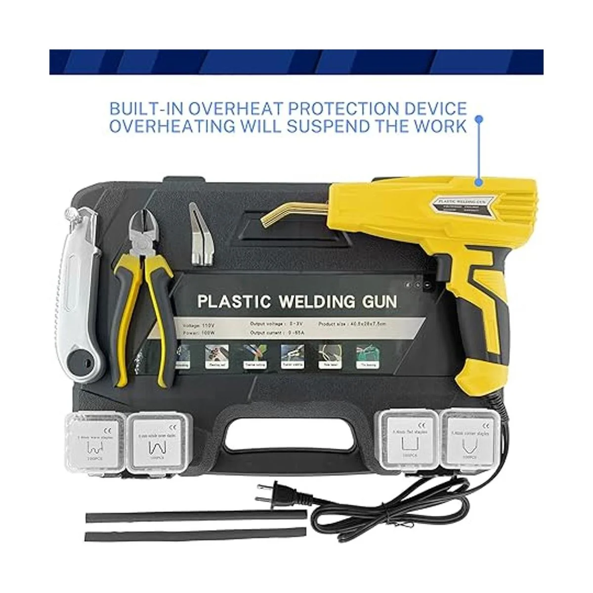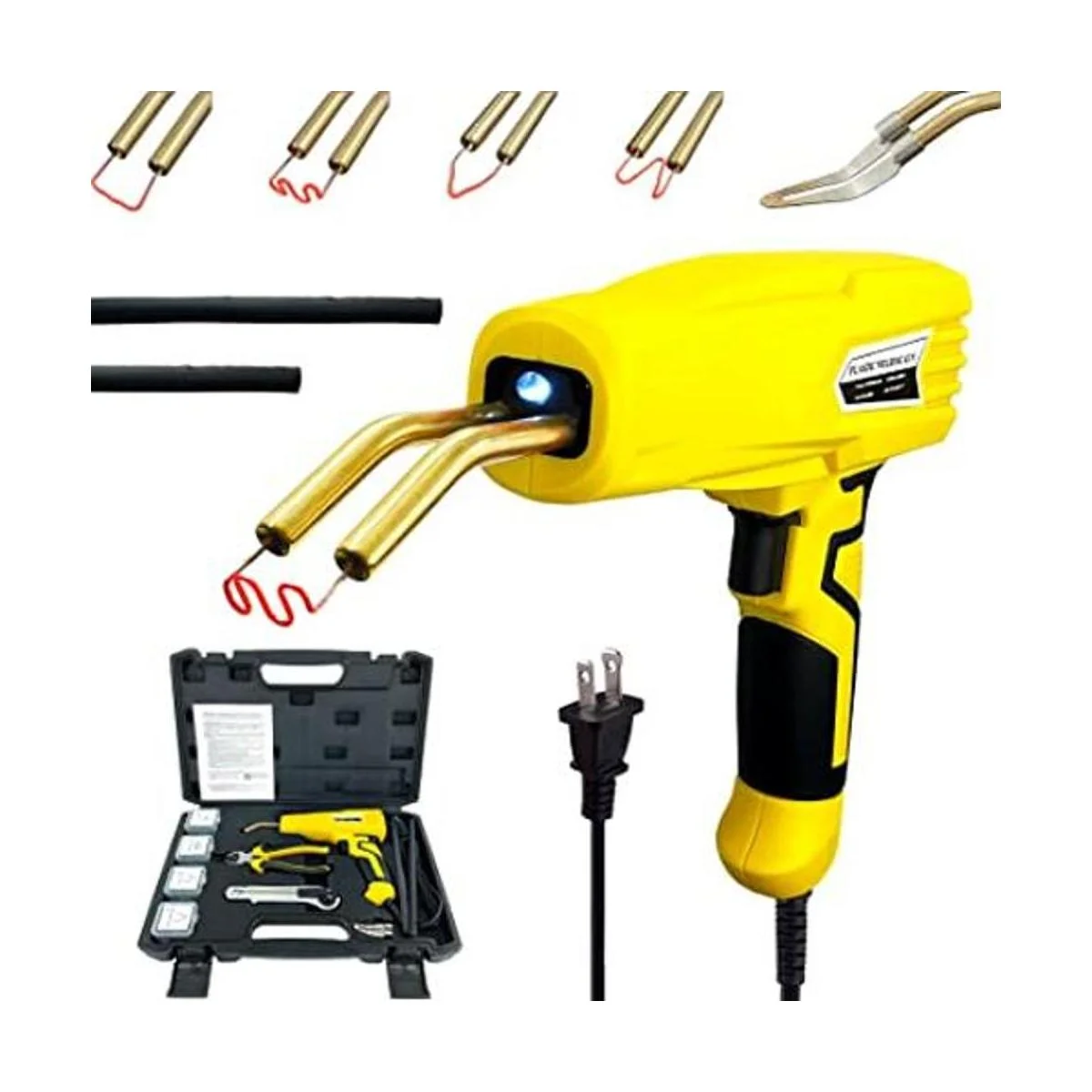 Allturn Versión mejorada de 110 V100 W, kit de soldadura de plástico, kit de reparación de parachoques de automóvil, alicates, cuchillos, esquinas planasexterioresesquinas interioresgrapas onduladas, pistola de soldadura de plástico amarillo