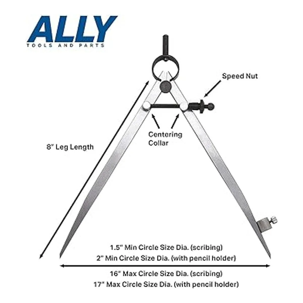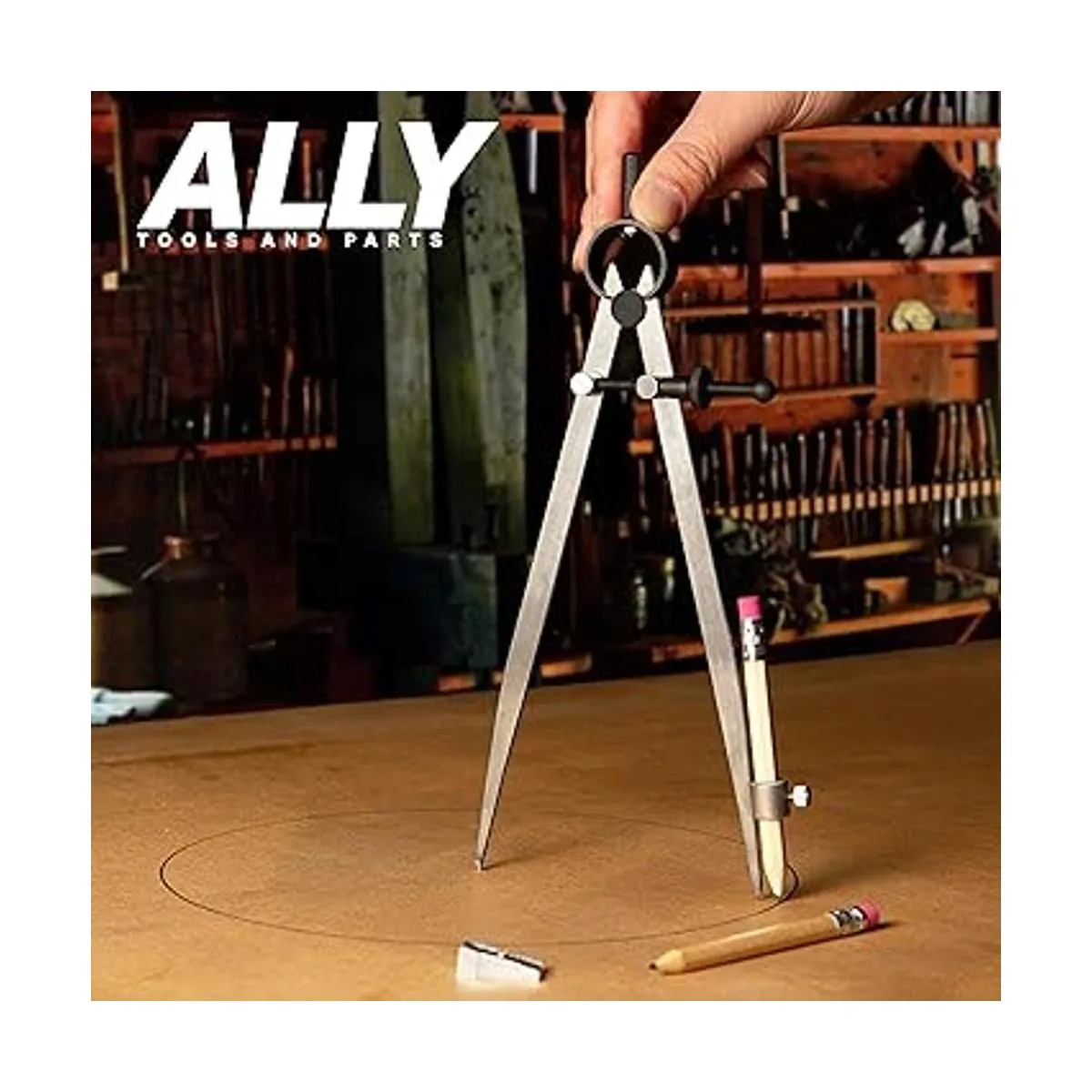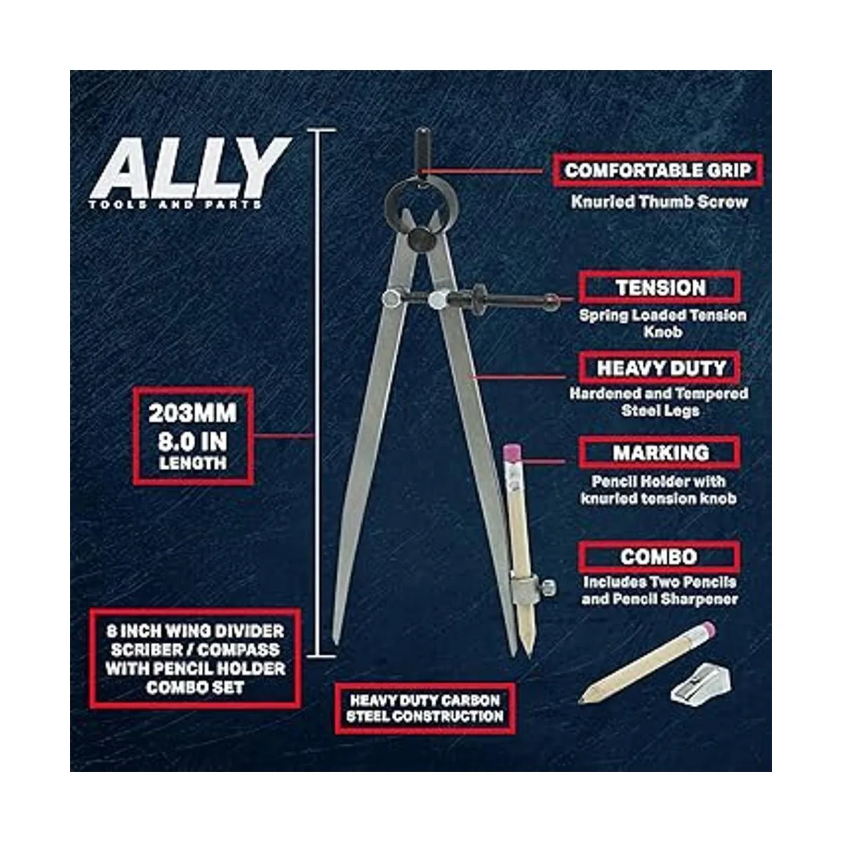 ALLY Tools Divisor de precisión de 8.0 in, brújula para carpintería, incluye dos lápices y sacapuntas, ideal para dibujar círculos, geometría, madera, metal y cuero