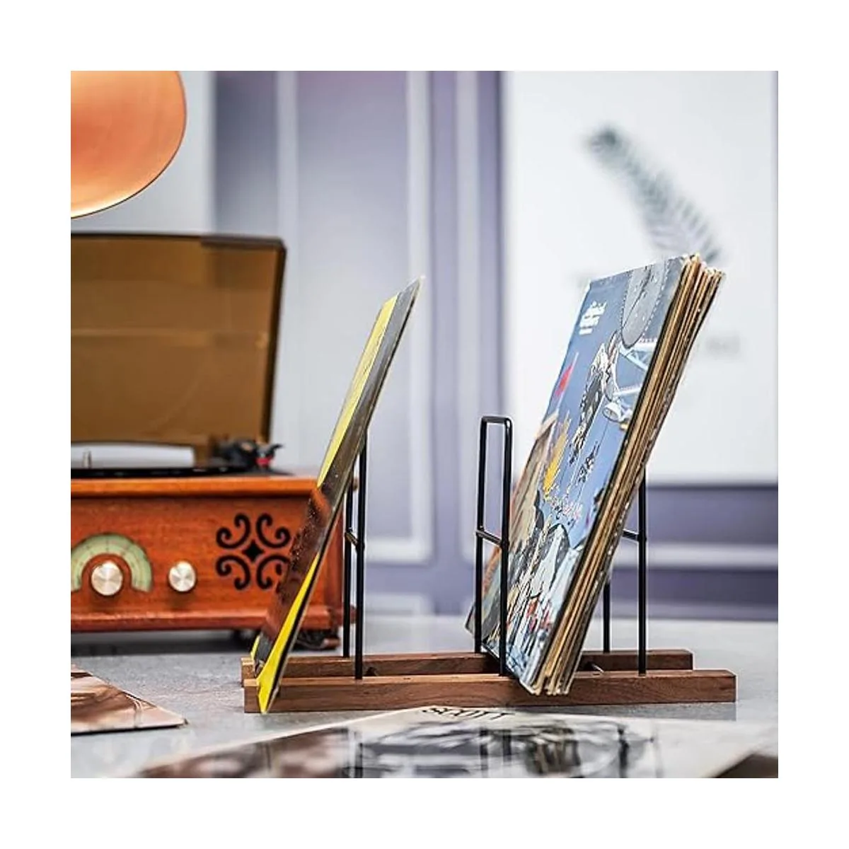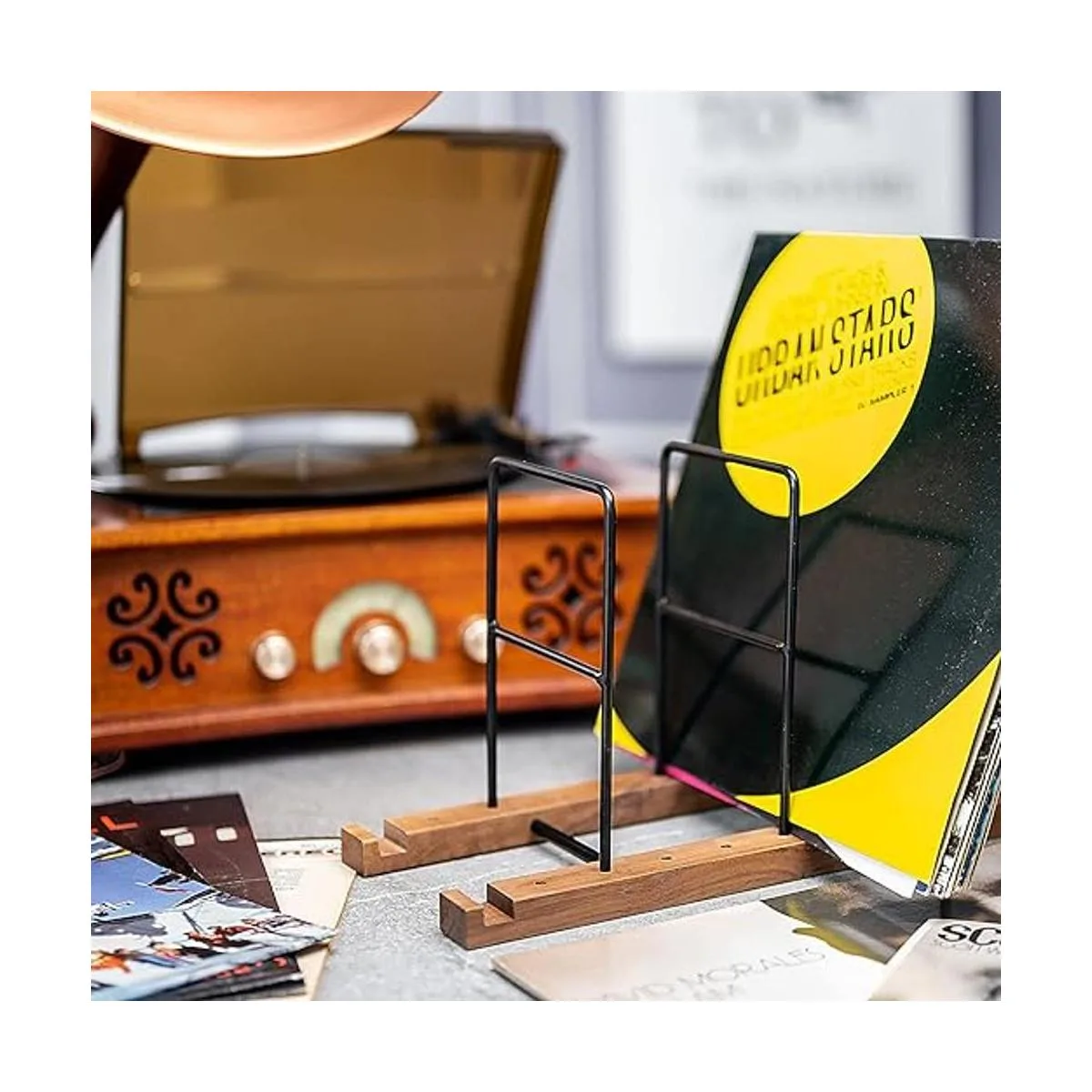 Fácil de montar: desliza 3 soportes de vinilo en los agujeros; los soportes están diseñados para ser muy resistentes para mantener el LP en posición vertical, evitando el desgaste y daños puede cambiar de posición muchas veces; los dos soportes inferiores pueden mantenerse firmemente en cualquier superficie, con alfombrilla antideslizante