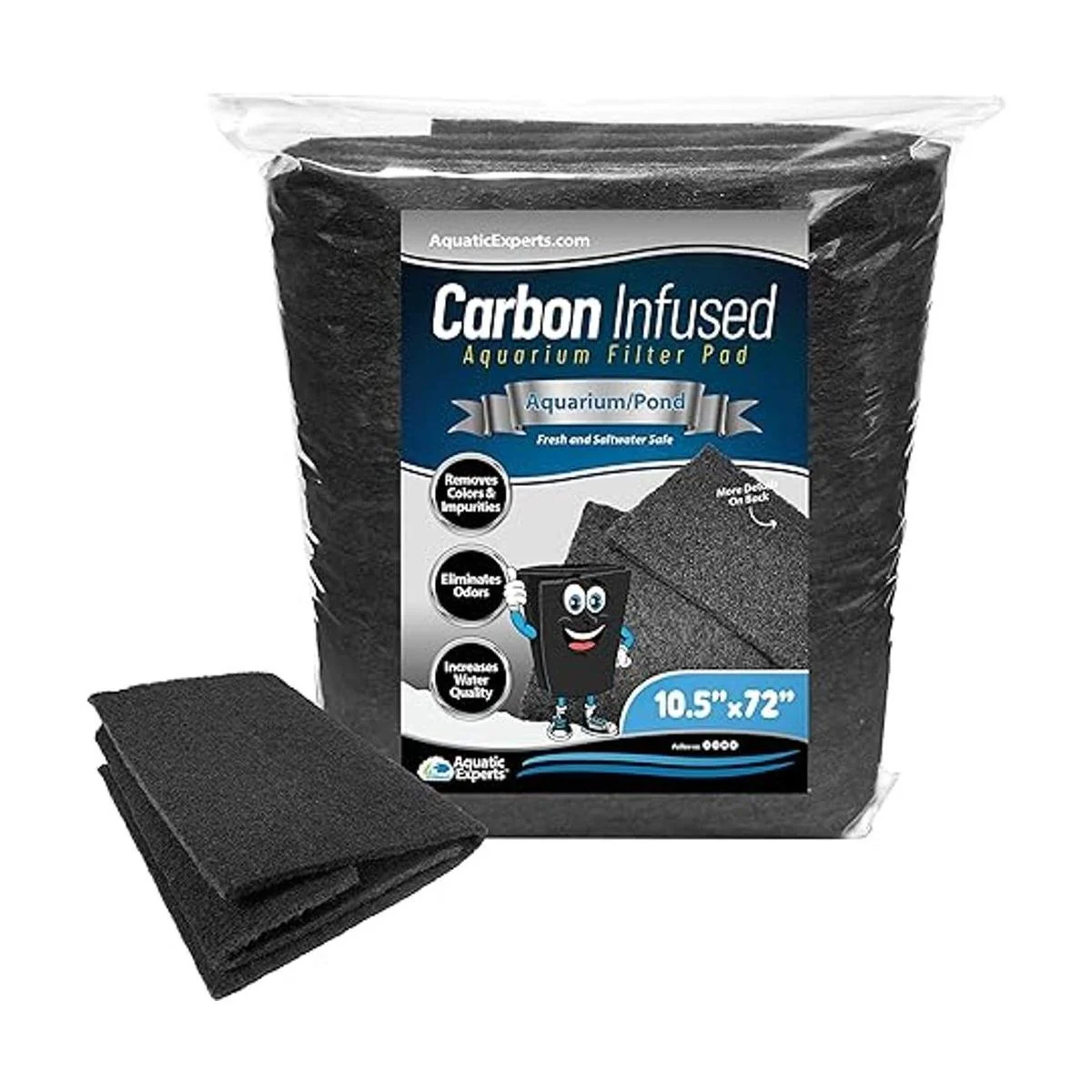 Corte para adaptar: las almohadillas de filtro de carbono se pueden cortar para adaptarse prácticamente a cualquier filtro. Funcionan bien en acuarios de agua dulce y salada e incluso estanques. Sea cual sea el filtro que utilices, la almohadilla de filtro de carbono funcionará para ti. Comprar a granel te ahorrará aún más dinero al comprar material de filtro precortado listo para usar. La almohadilla de carbono mide 10.5 in x 72.0 in y 0.4 in 0.5 in de grosor.