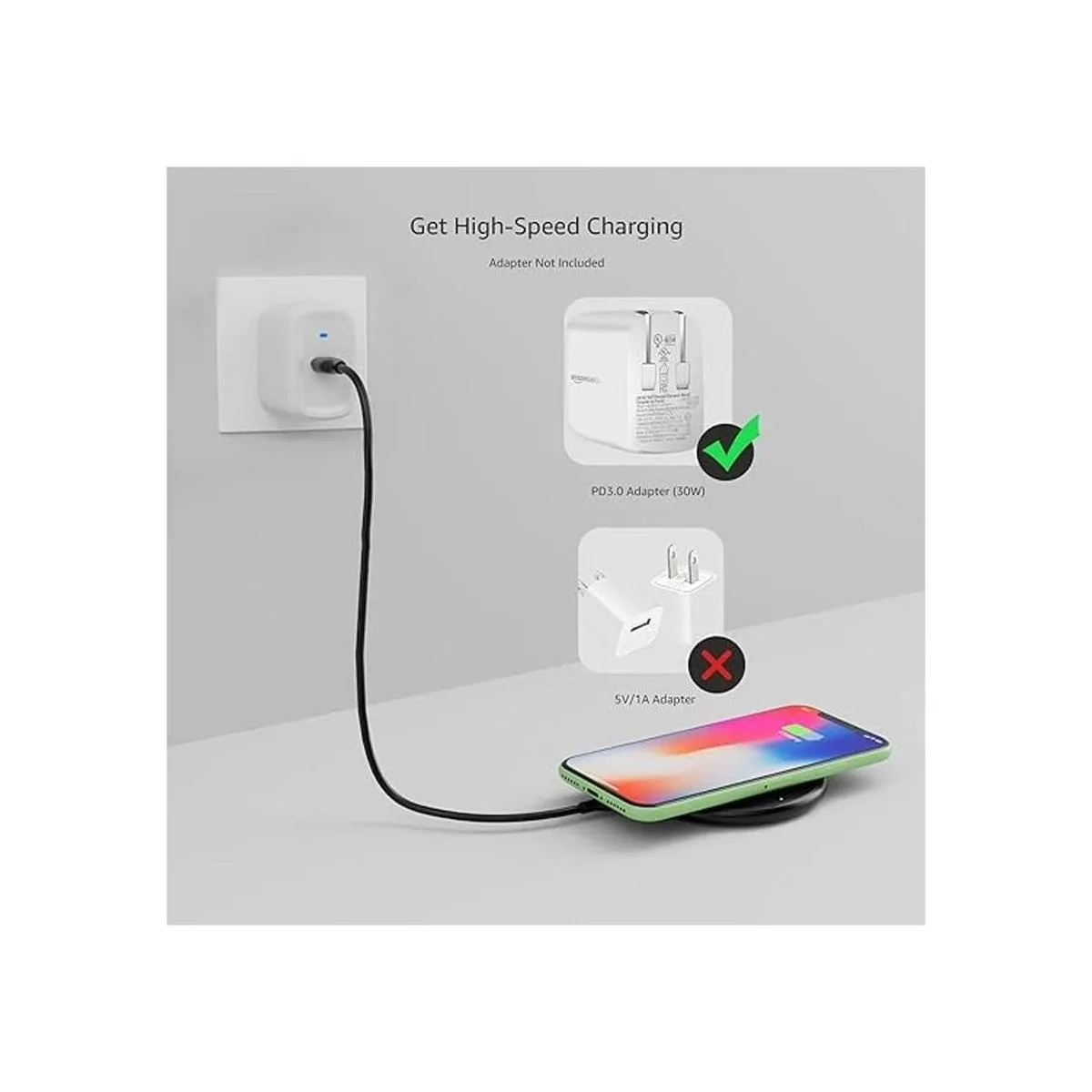 Lo que obtienes: almohadilla de carga inalámbrica de 15 W, cable USB 2.0 A a C de 4 pies, guía de bienvenida, servicio al cliente dedicado y una garantía limitada estándar de 1 año de Basics. Nota: adaptador de CA no incluido