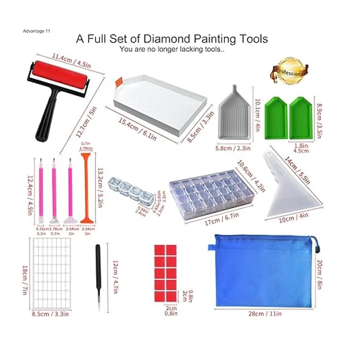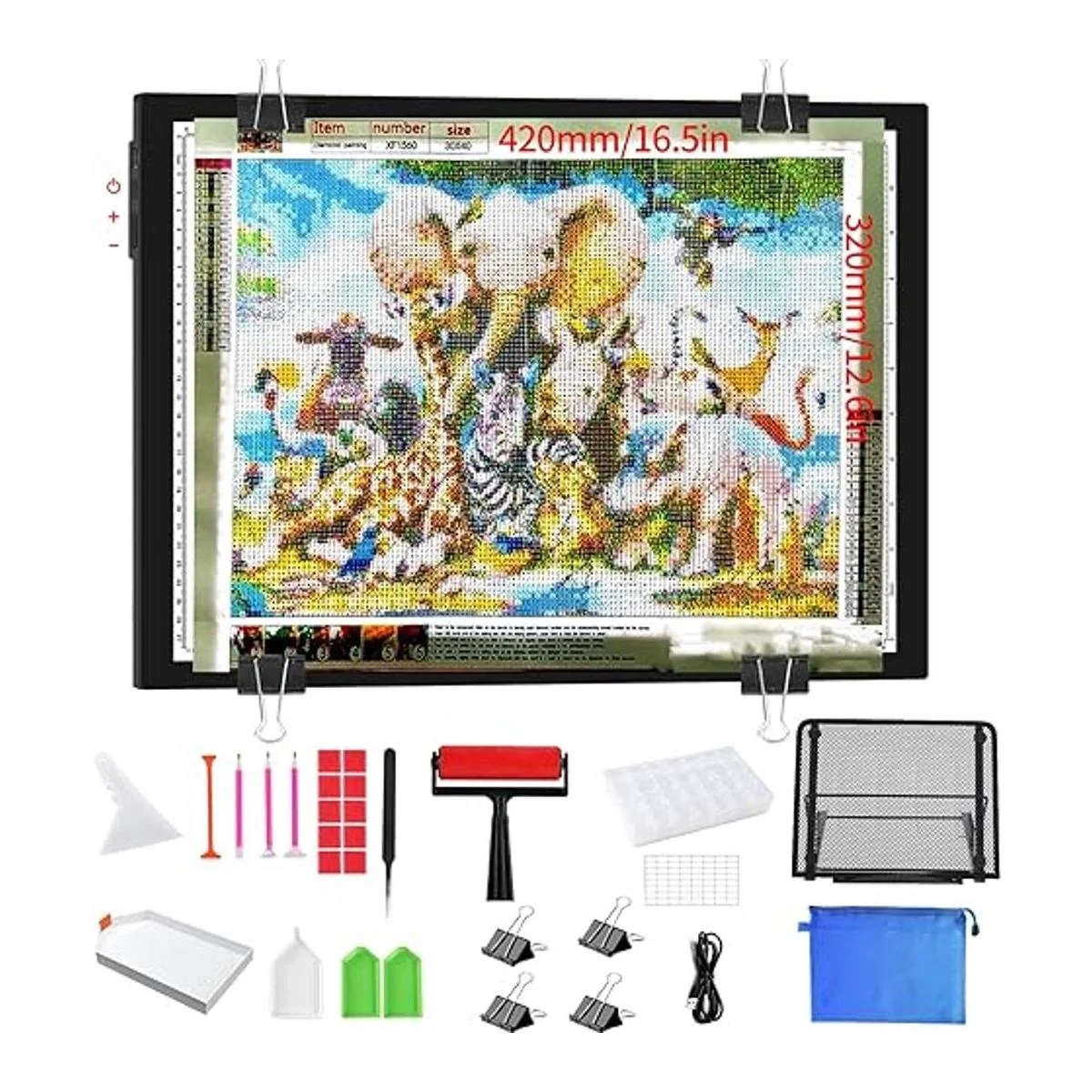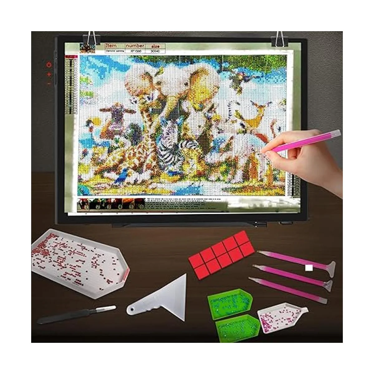 Juego de herramientas de arte de diamantes perfecto: este juego cuidadosamente seleccionado para ti contiene todas las herramientas necesarias para el arte de diamantes: almohadilla de luz A3 de gran superficie, soporte de metal profesional, rodillo de pintura de diamantes, contenedores de almacenamiento de diamantes, bandejas de diamantes, bolígrafos de taladro, herramienta de fijación, clips, pinzas de metal, pegamento, etc.