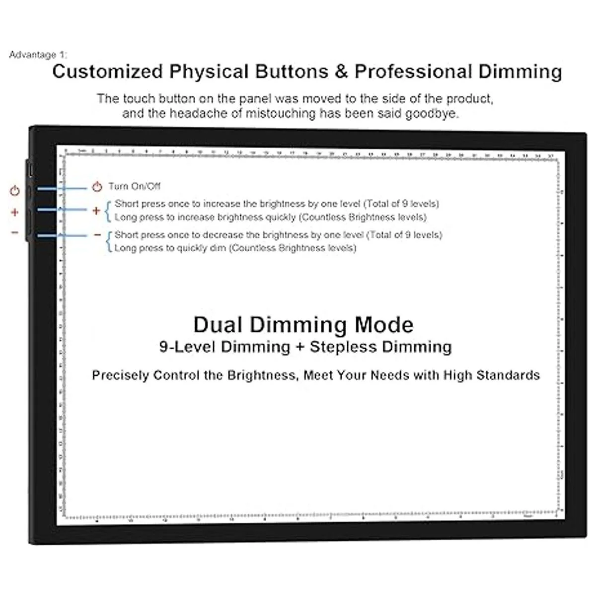 Botones físicos, modo profesional de atenuación dual: los interruptores A3 de la almohadilla de luz de pintura de diamante y los botones de atenuación en el panel se mueven al lado del producto, lo que evita completamente el dolor de cabeza del tacto equivocado. Pulsa brevemente / una vez para iluminar/oscurecer un nivel de brillo, este modo soporta 9 niveles de brillo; pulsa durante mucho tiempo / para iluminar/oscuro rápidamente, este modo soporta innumerables niveles de brillo.