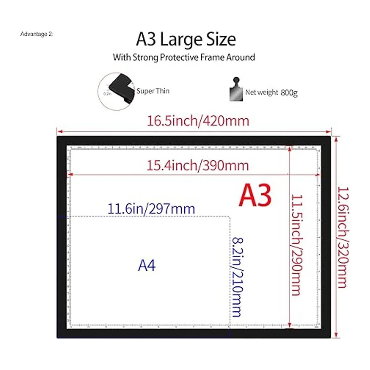 Almohadilla de luz grande A3: el tablero de luz de pintura de diamantes A3 L: 16.6 pulgadas x 12.6 pulgadas, el tamaño del área brillante es L: 15.4 pulgadas x 11.4 pulgadas, el grosor es de solo 0.24 pulgadas.