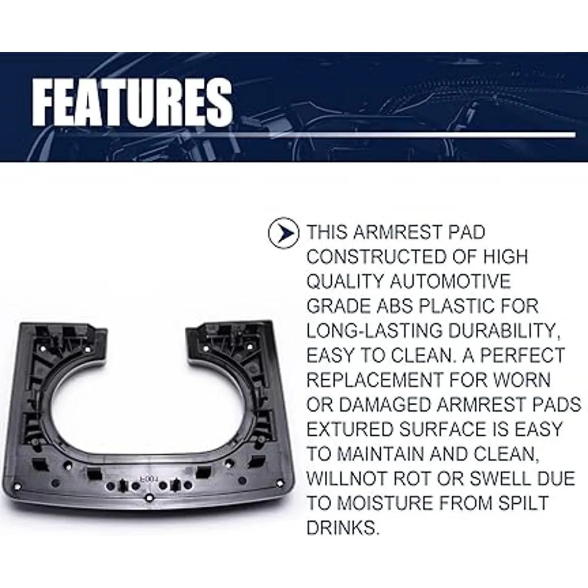 Características: esta almohadilla para reposabrazos está fabricada con plástico ABS de alta calidad de grado automotriz para una larga durabilidad, fácil de limpiar. Un reemplazo perfecto para almohadillas de reposabrazos desgastadas o dañadas. La superficie texturizada es fácil de mantener y limpiar, no se pudre ni se hincha debido a la humedad de bebidas derramadas.